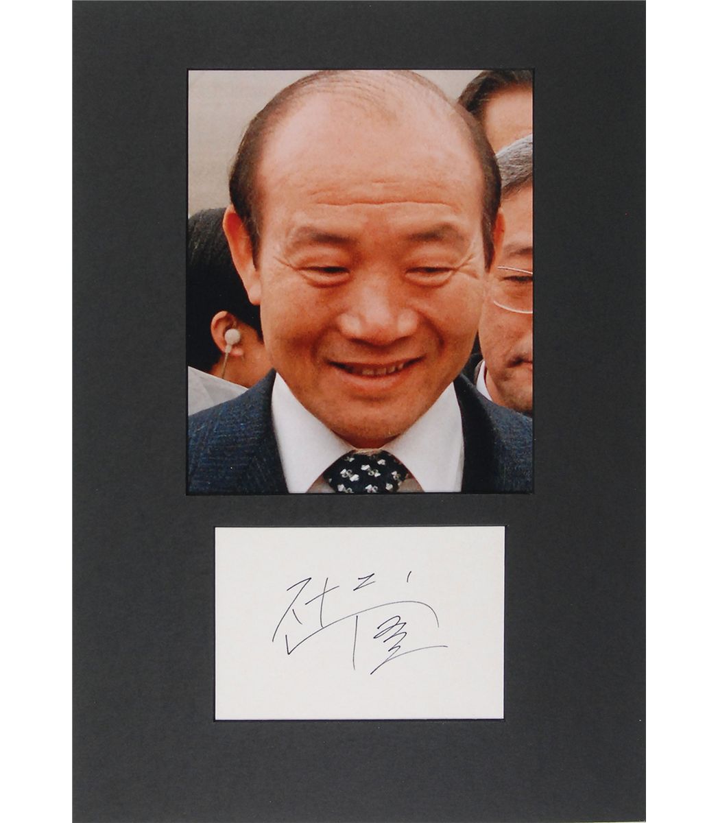 Republic of Korea Army general (born 1931) who served as president of South Korea from 1980 to 1988. Felt tip signature of Chun Doo-hwan on a white 4.5 x 3.25 card. Removably matted in corner mounts with a portrait to an overall size of 8.25 x 11.75. In very fine condition.