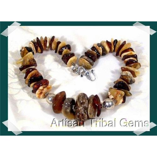 Welcome to Artisan Tribal Gems and our handcrafted natural BALTIC amber showcase. Our amber necklaces are unique for they sport an abundance of silver and sterling closures not the plastic closures found on most Baltic necklaces. Vera has chosen large amber nuggets measuring up to 34mm accented with the finest of tribal silver. A large 14mm sterling beads accents the center. The necklace has a length of 17" with an impressive gram weight of 110.