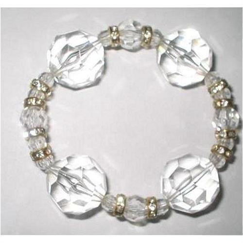 Four very large and chunky Multi faceted lucite globes, measuring a full one inch across, separated by smaller lucite globes in two different sizes of one half inch and one quarter inch across and lots and lots of bezel set rhinestone rondels in goldtone, which beautifully details the clear crystal like look of the lucite. Minty condition, no flaws. Measures 3-1/2" inches in diameter, unstretched. Absolutely fabulous, a "must have" for your next party!