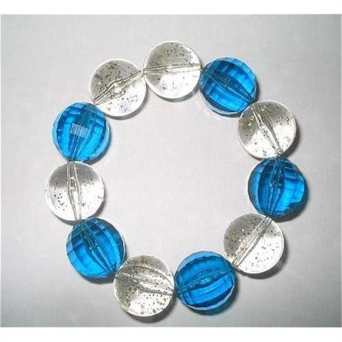 So perfect for Summer!. Smooth round clear lucite globes with tiny flecks of gold and silver confetti inside, alternating with brilliant kingfisher blue Multi faceted globes. Measures a diameter of 2-1/4" inches from the inside - unstretched. This very striking bangle bracelet is in perfect condition, no scratches or scuffs at all. Fabulous!