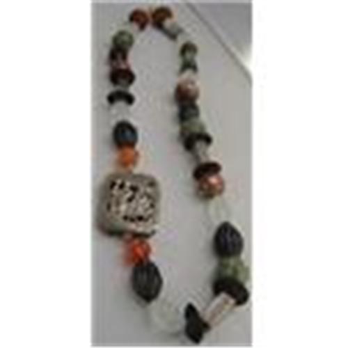 Super hand crafted multi gemstone necklace consisting of an antique Chinese silver incense holder, silver engraved bars each over 100 years old, Chinese Cloisonné beads, Leopard Jasper, Fancy Jasper, Carved Cornelian, Carved Adventurine, and gorgeous Fluted Crystals.