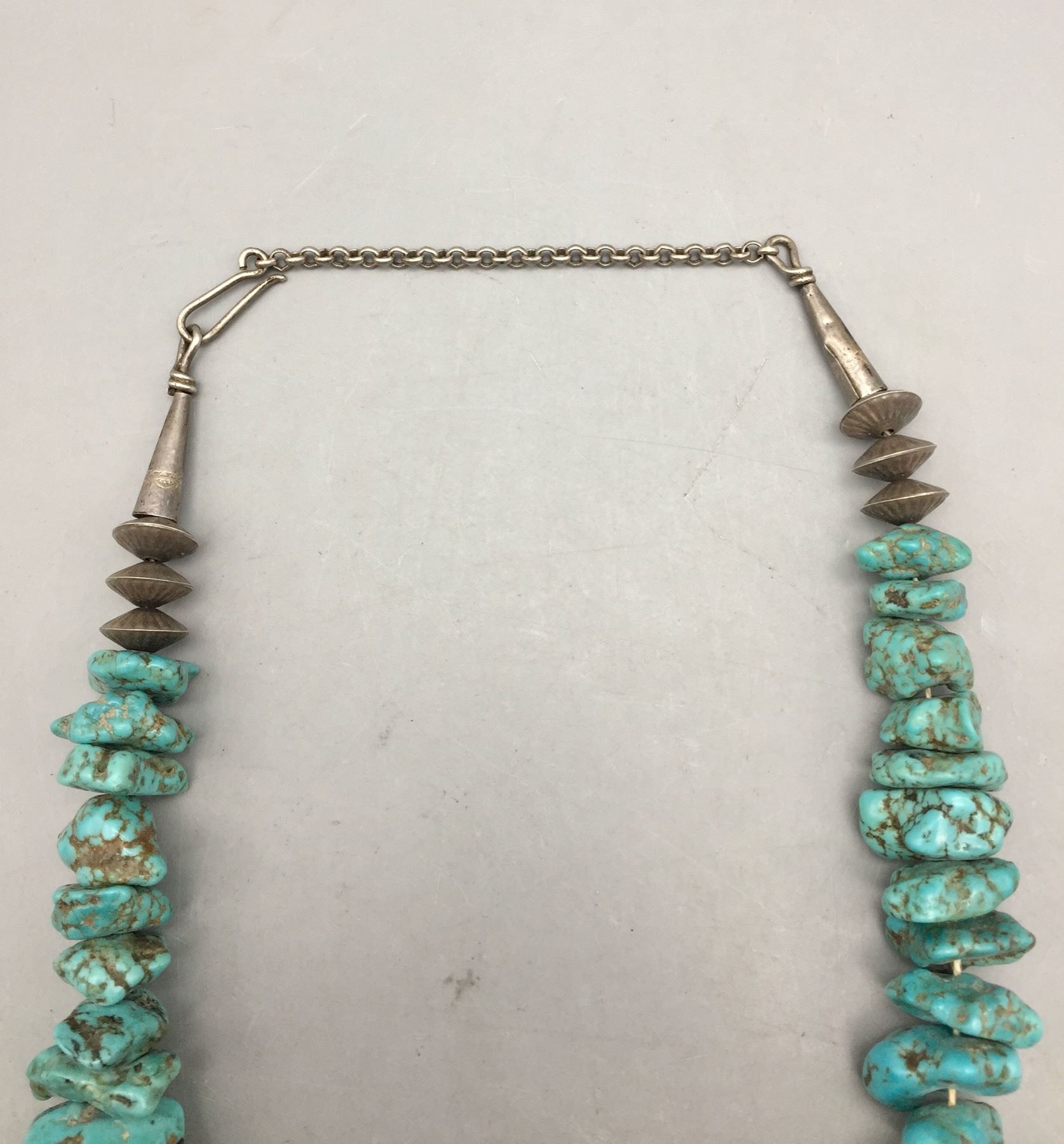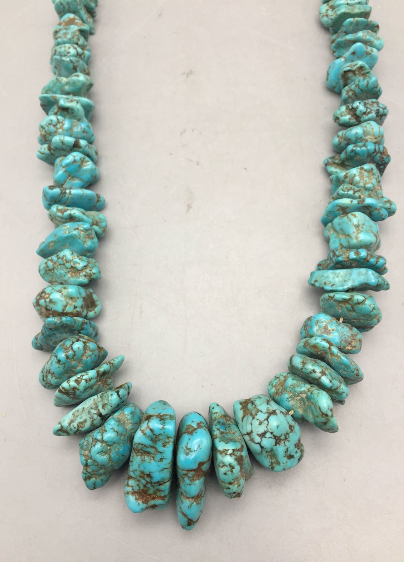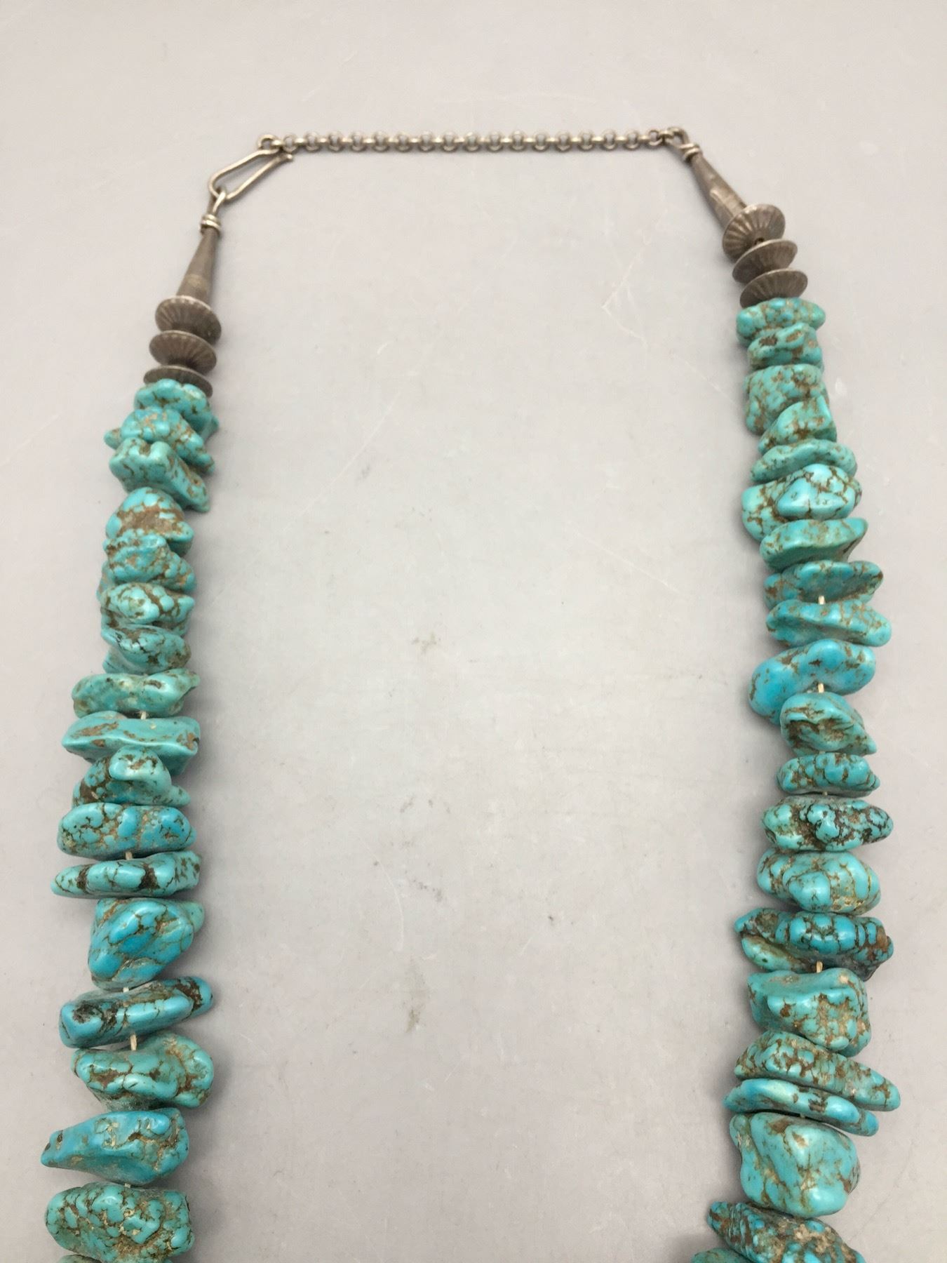 Description: Offered for sale in this lot is this vintage, chunky turquoise necklace featuring large nugget style turquoise stones. It has sterling silver fluted beads and a small chain extender. It was strung on waxed nylon cord. This is a great older necklace and it would look nice layered or worn alone! Maker: Unknown. Approx. Age: Vintage. Size: Fits a 22 inch neck. 194.1 grams. Condition: Good for its age, normal wear expected. Please look closely at the pictures - they are an important part of our description. Shipping: There will be a $5 handling, packaging fee for shipping this lot. The actual cost of postage will be added on top of that.