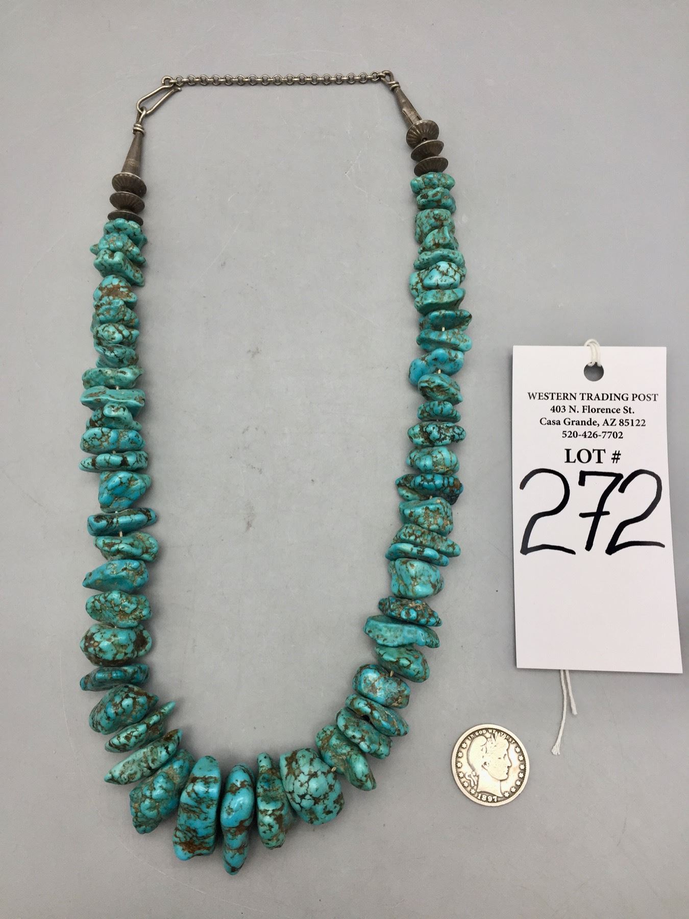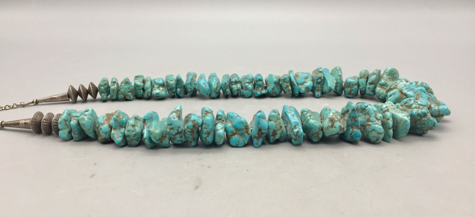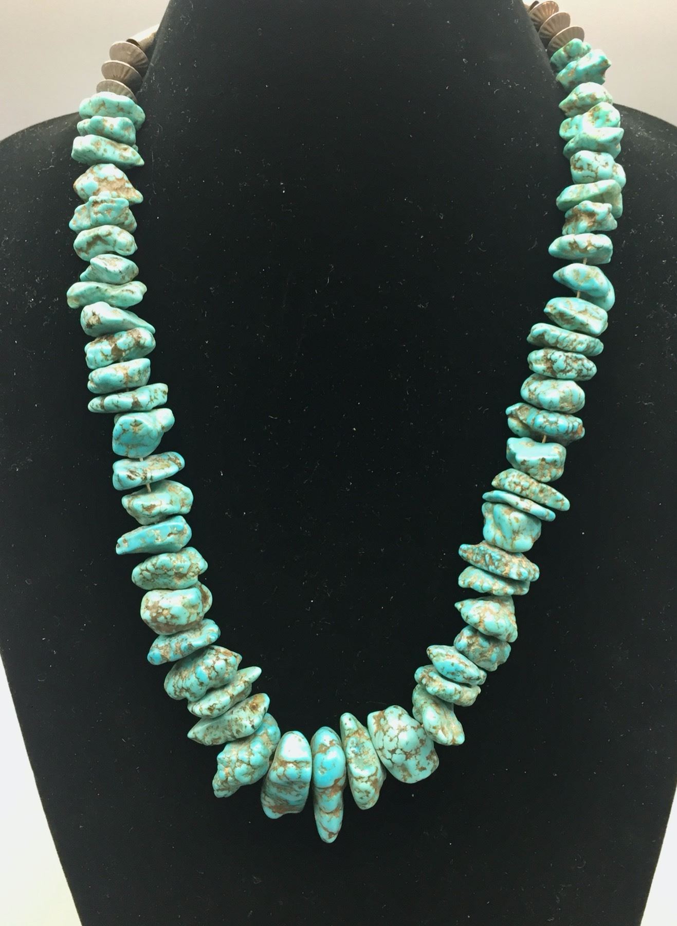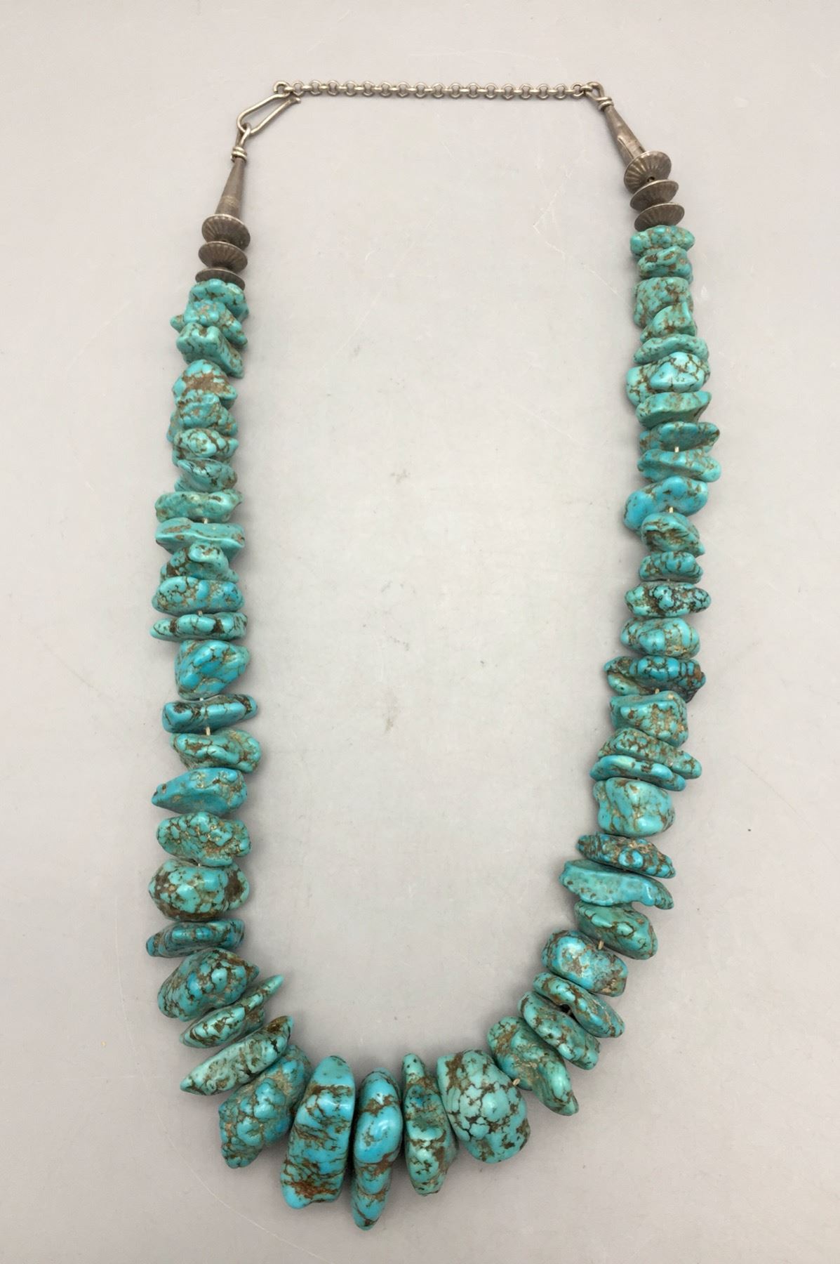 Description: Offered for sale in this lot is this vintage, chunky turquoise necklace featuring large nugget style turquoise stones. It has sterling silver fluted beads and a small chain extender. It was strung on waxed nylon cord. This is a great older necklace and it would look nice layered or worn alone! Maker: Unknown. Approx. Age: Vintage. Size: Fits a 22 inch neck. 194.1 grams. Condition: Good for its age, normal wear expected. Please look closely at the pictures - they are an important part of our description. Shipping: There will be a $5 handling, packaging fee for shipping this lot. The actual cost of postage will be added on top of that.
