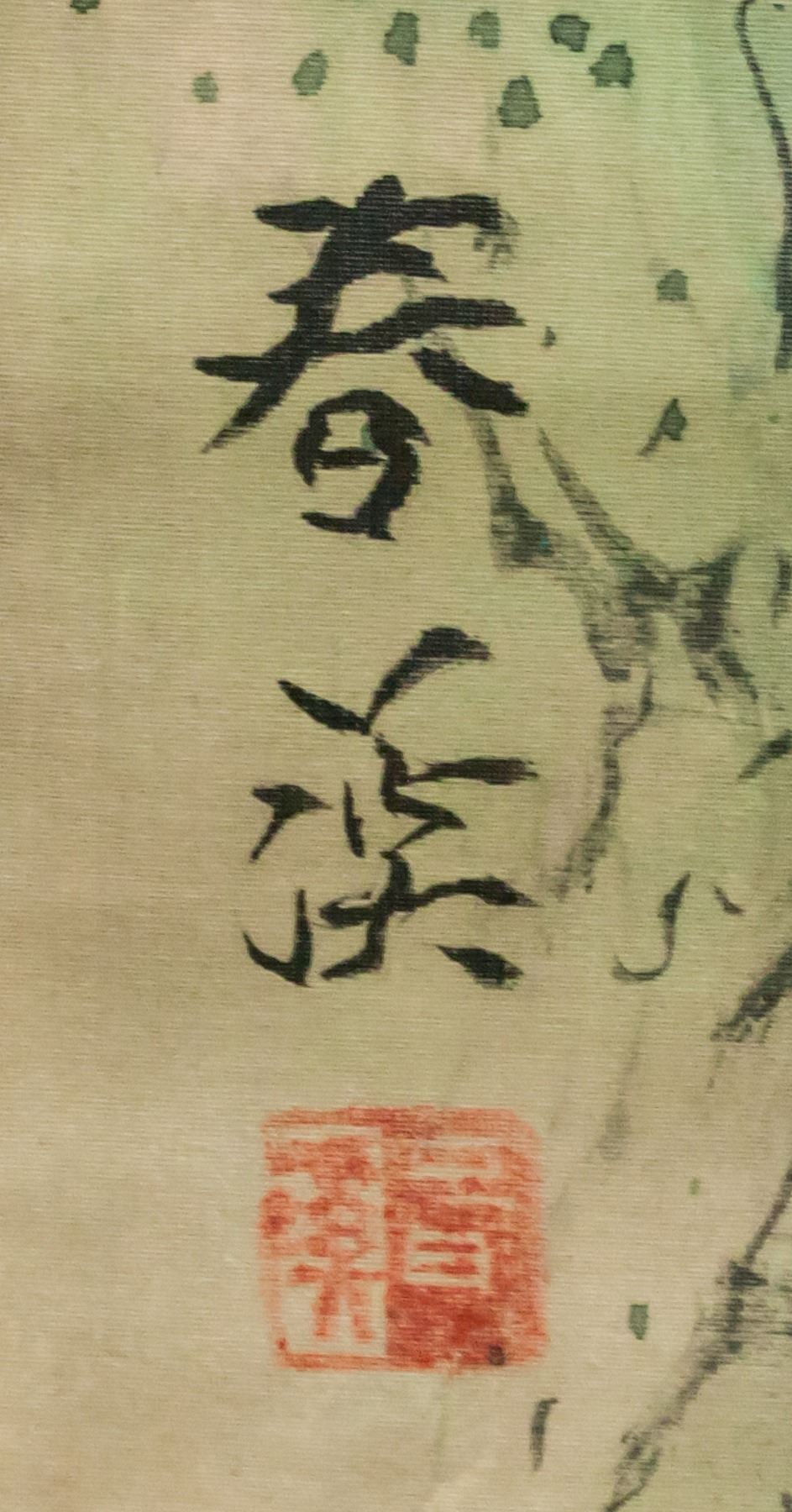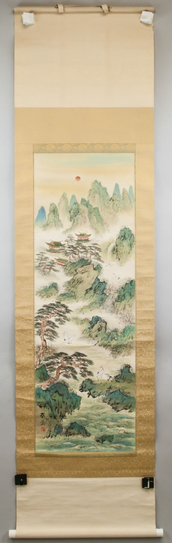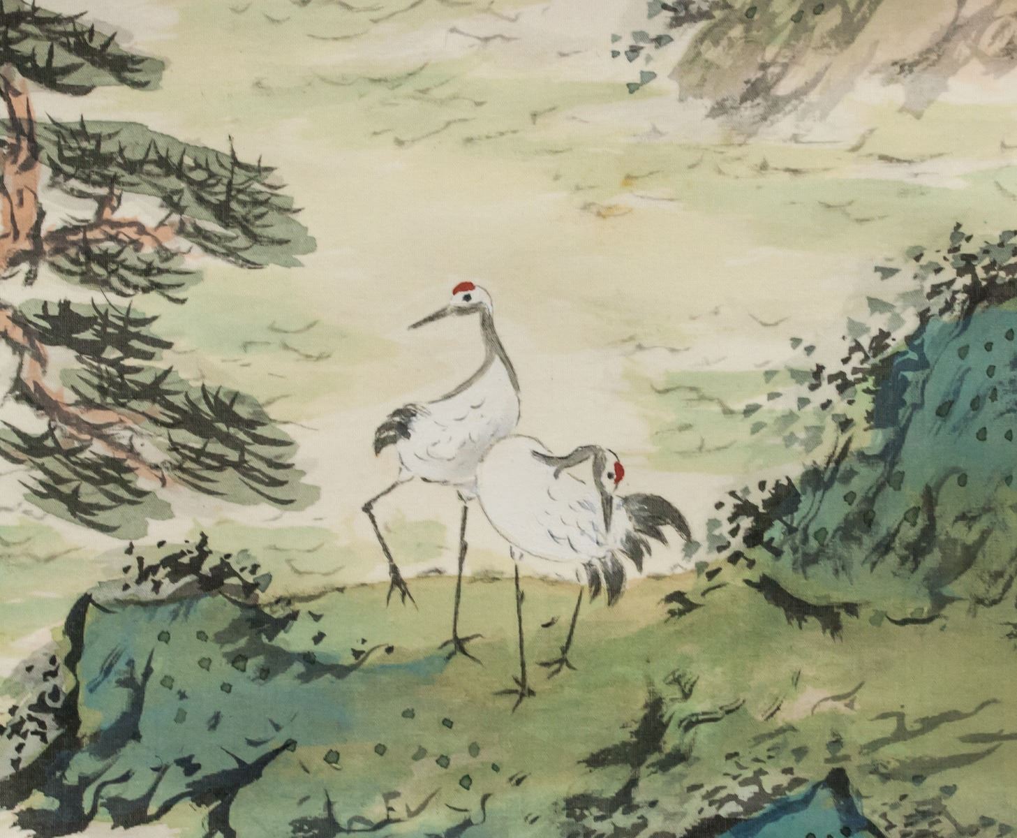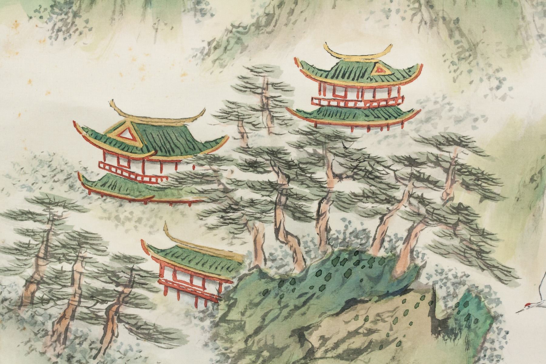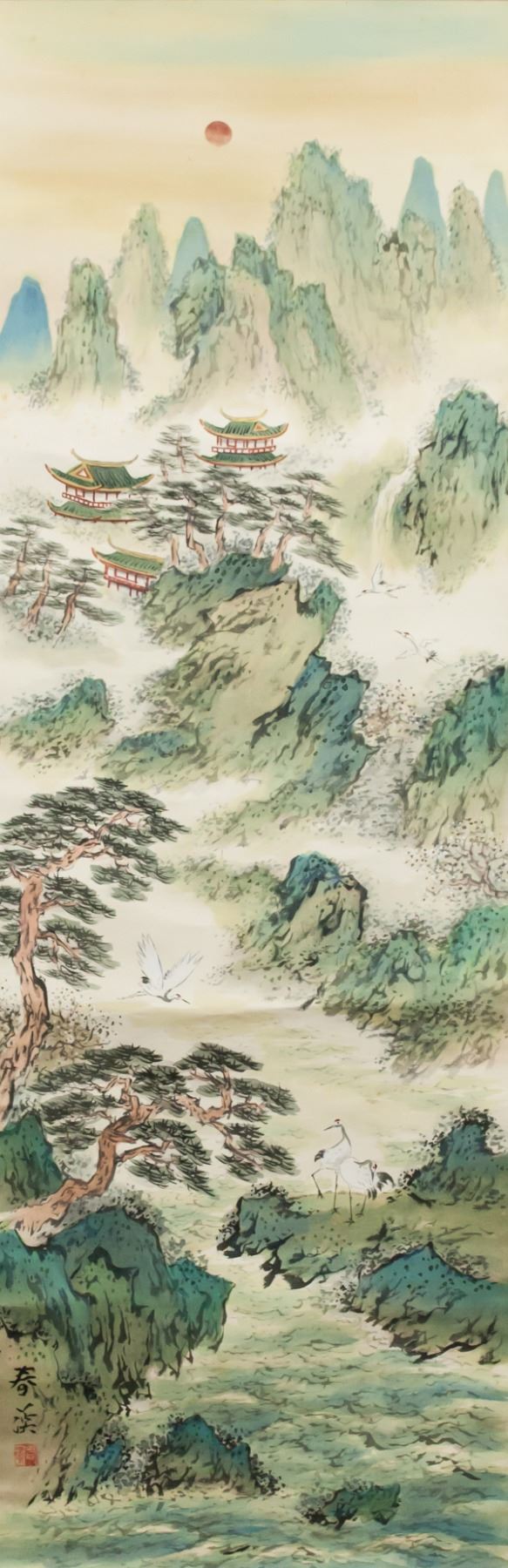 Ink and watercolor on silk, hanging scroll. Featuring mountainous landscape, pavilions and cranes. Signed Chunxi, inscribed with 1 artist seal.