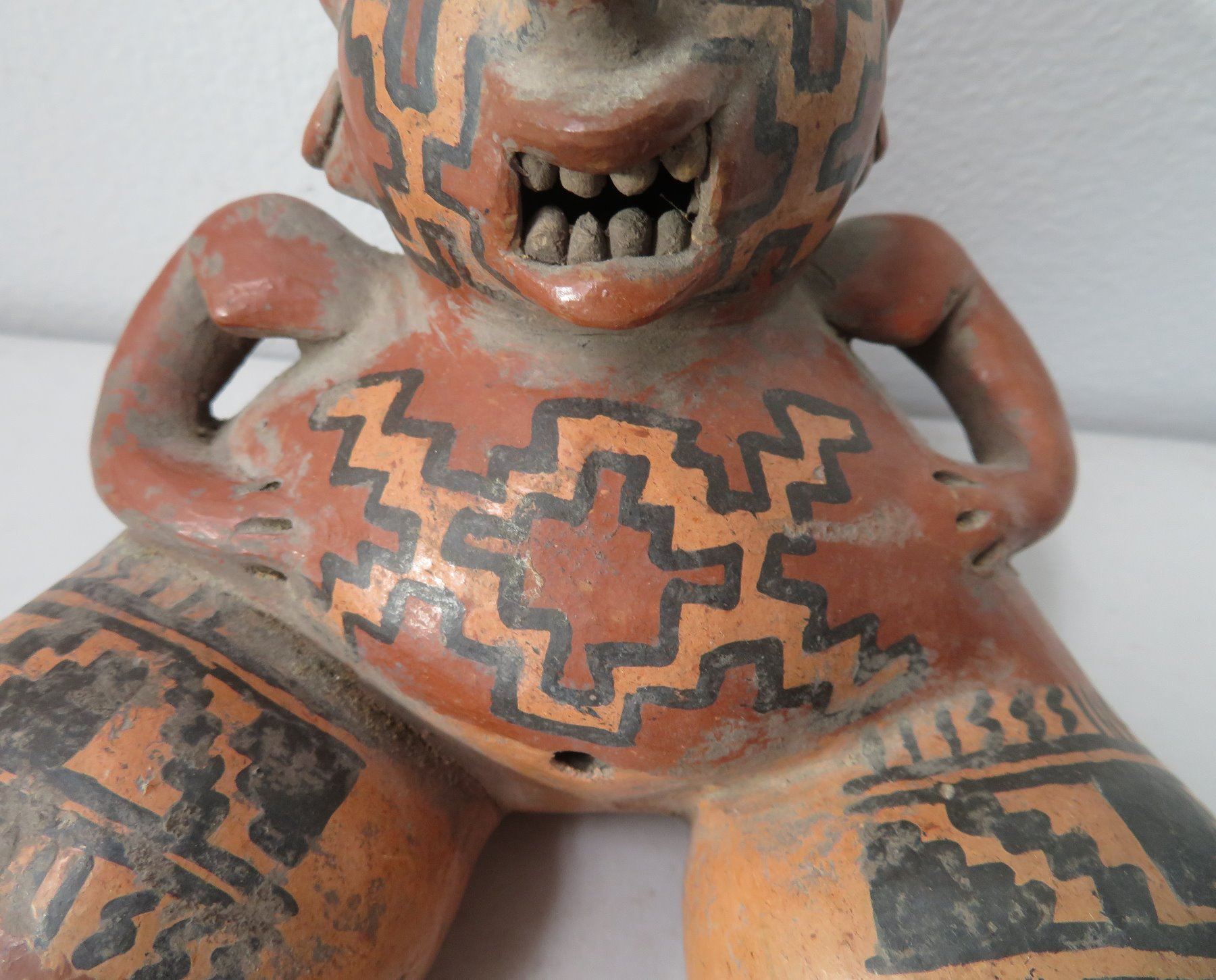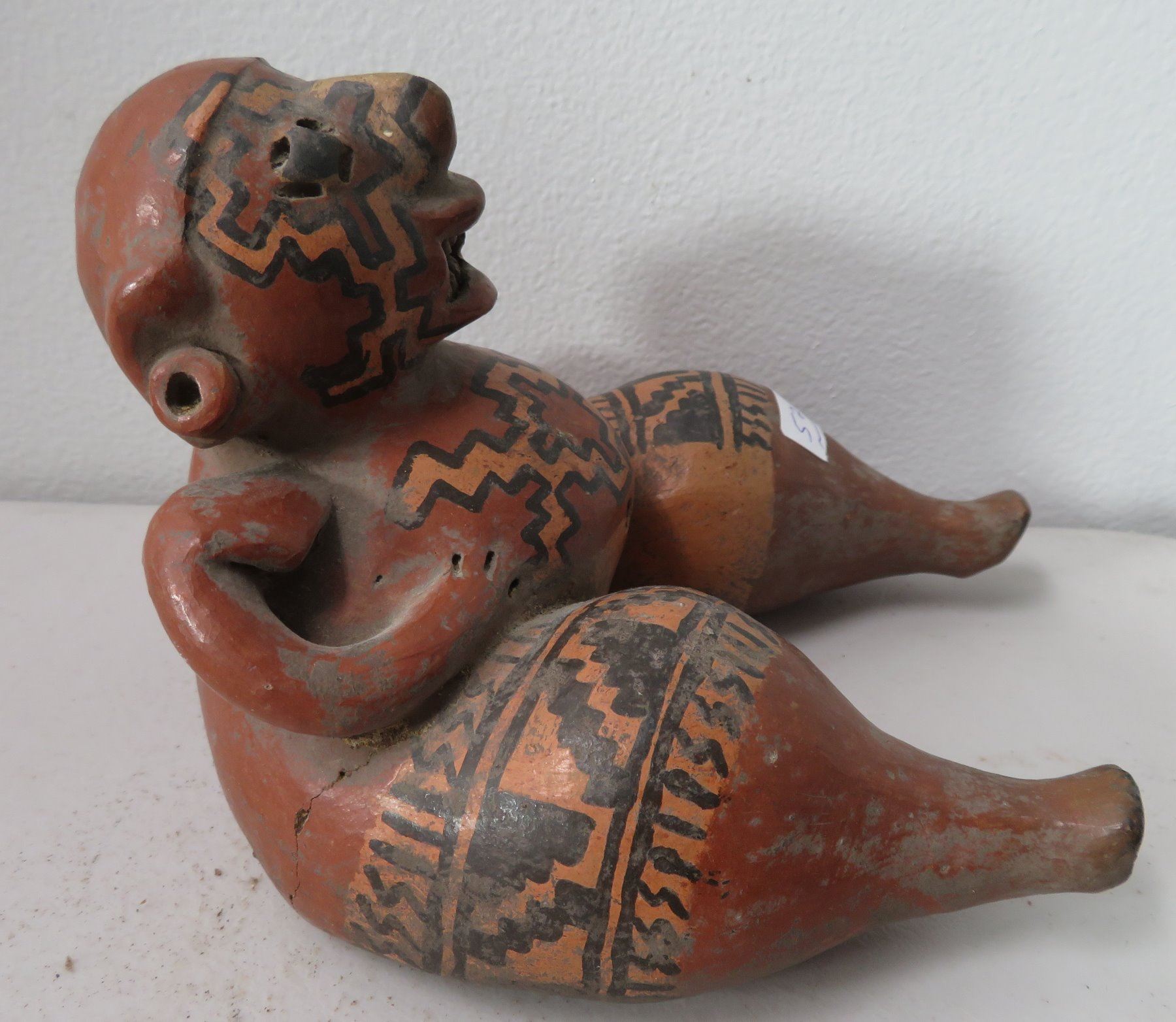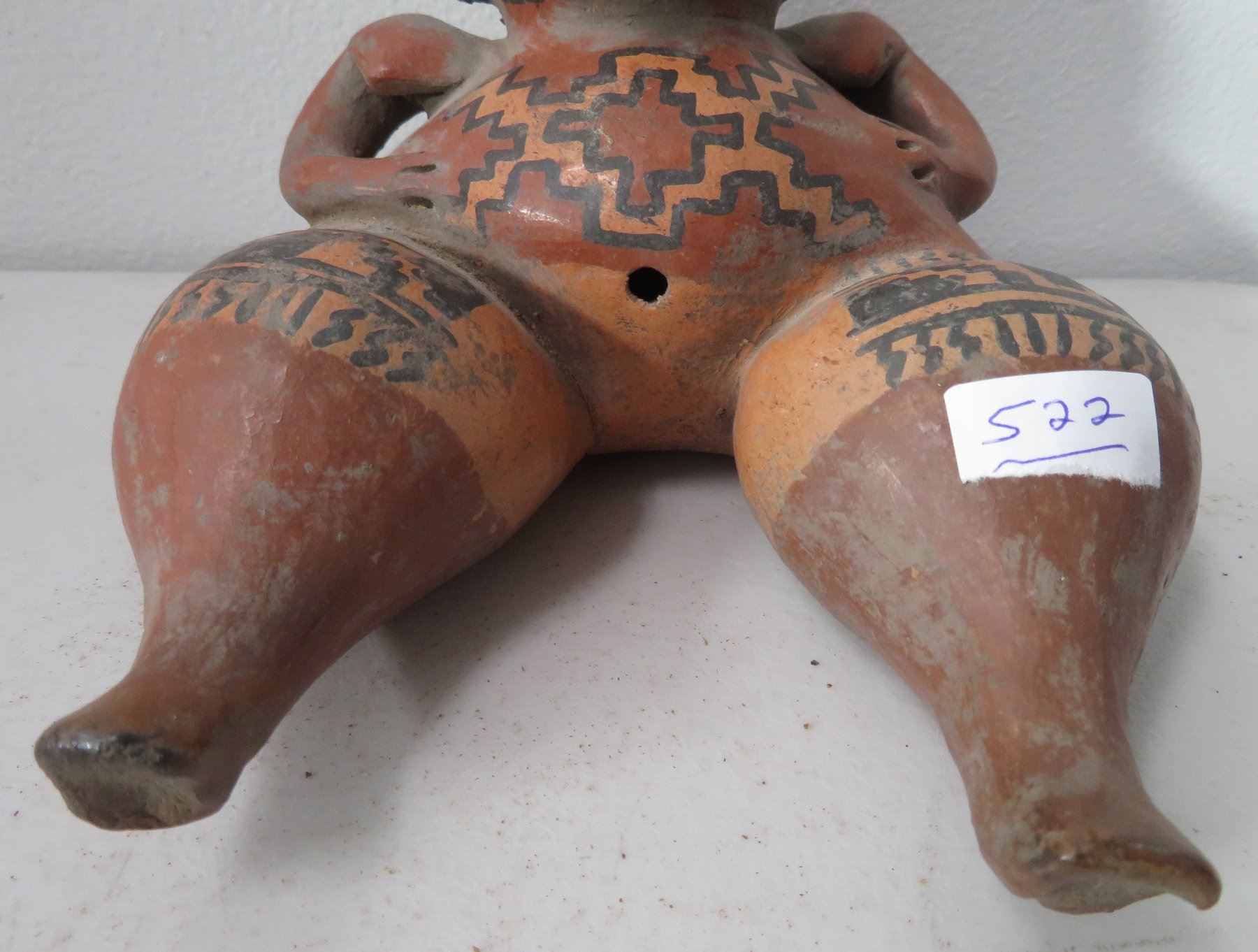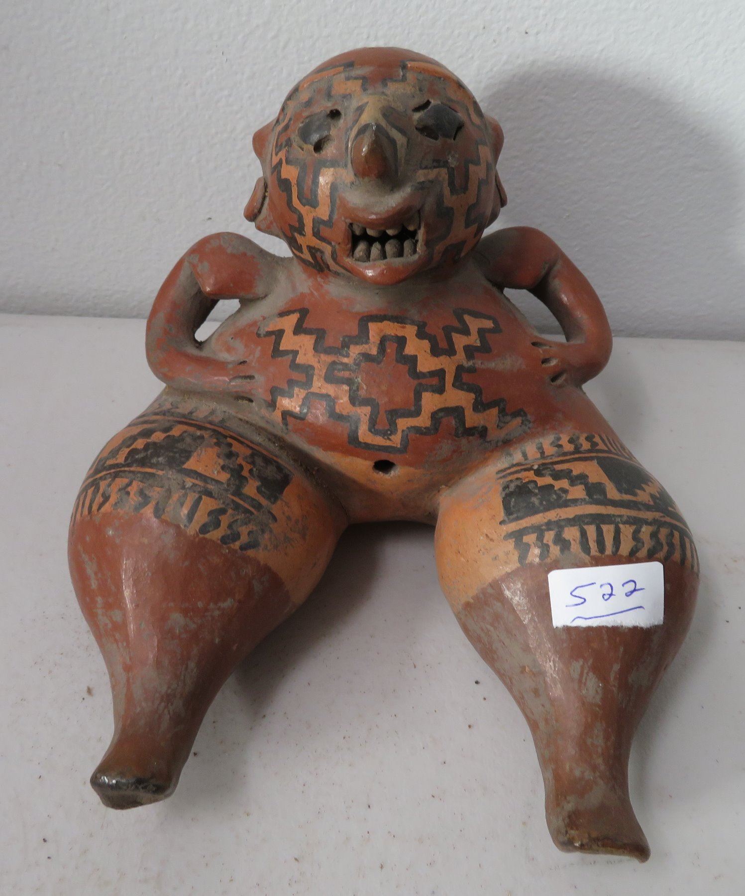 Chupicuaro Figure, pre-Columbian item. Made of clay and paint, the item measures 7" x 5 1/2". Chupicuaro, Mexico. Condition: Right leg broken and glued, see images. Shipping: $34.00 w/insurance and signature, due to size and weight.