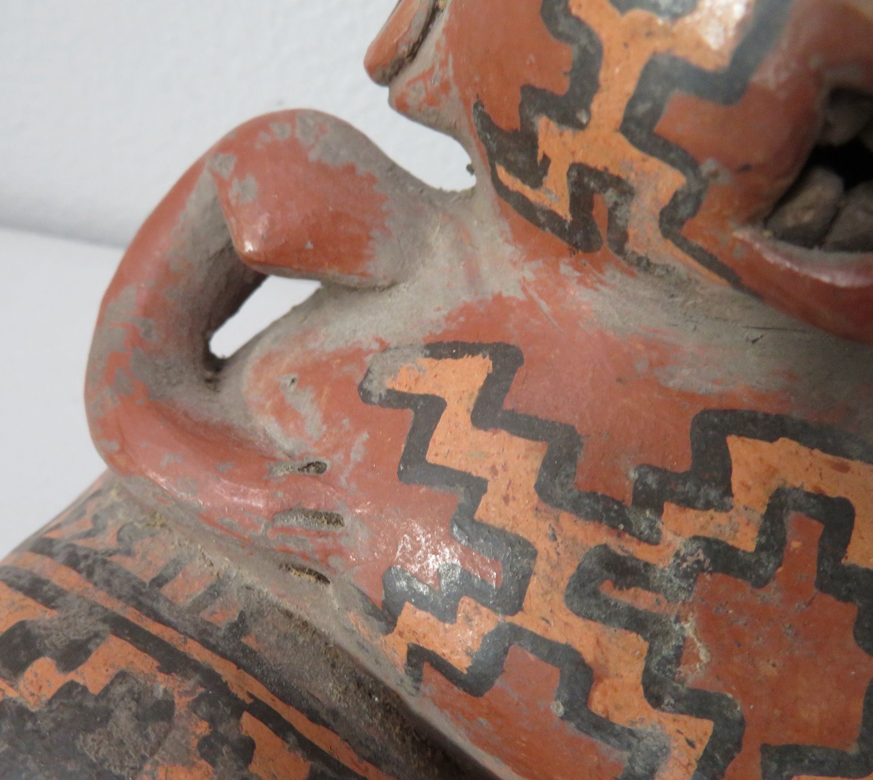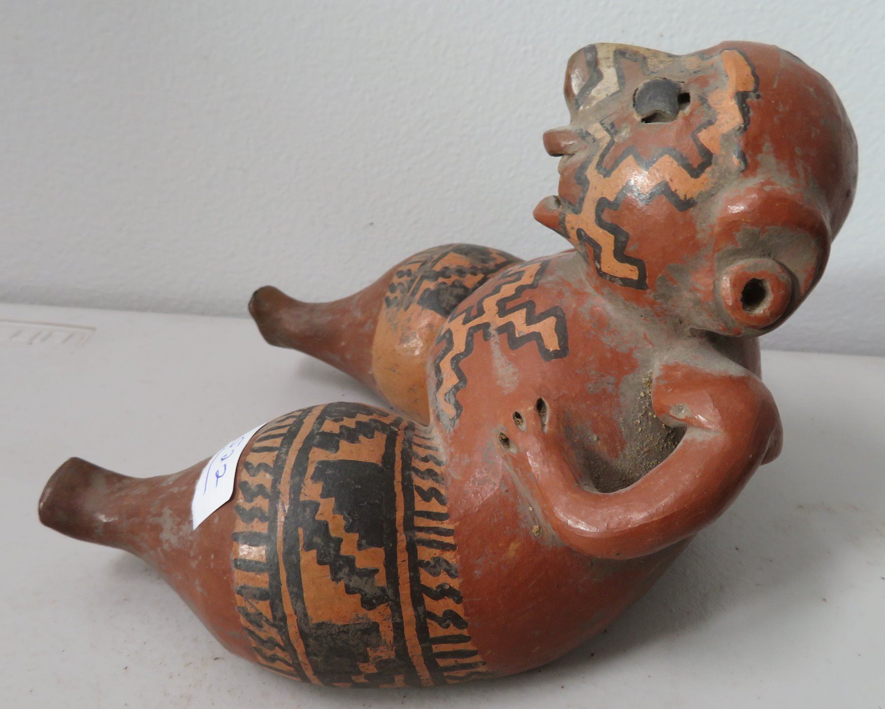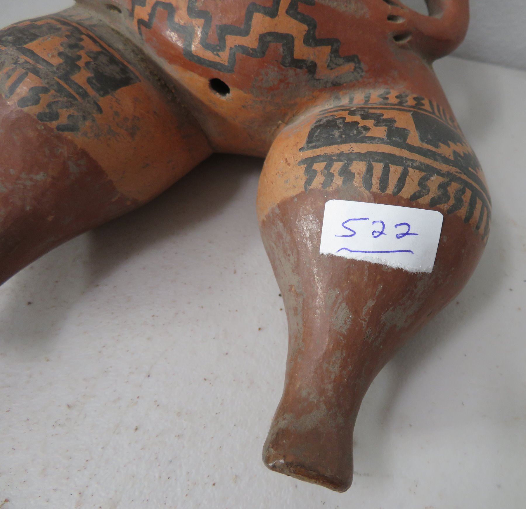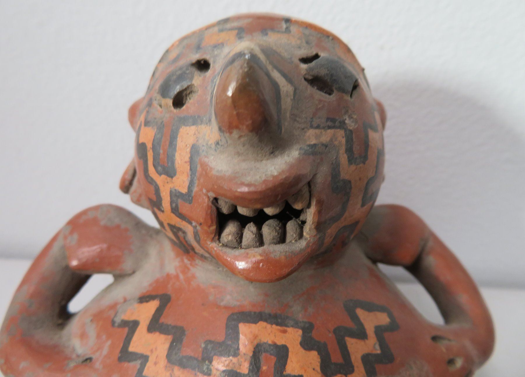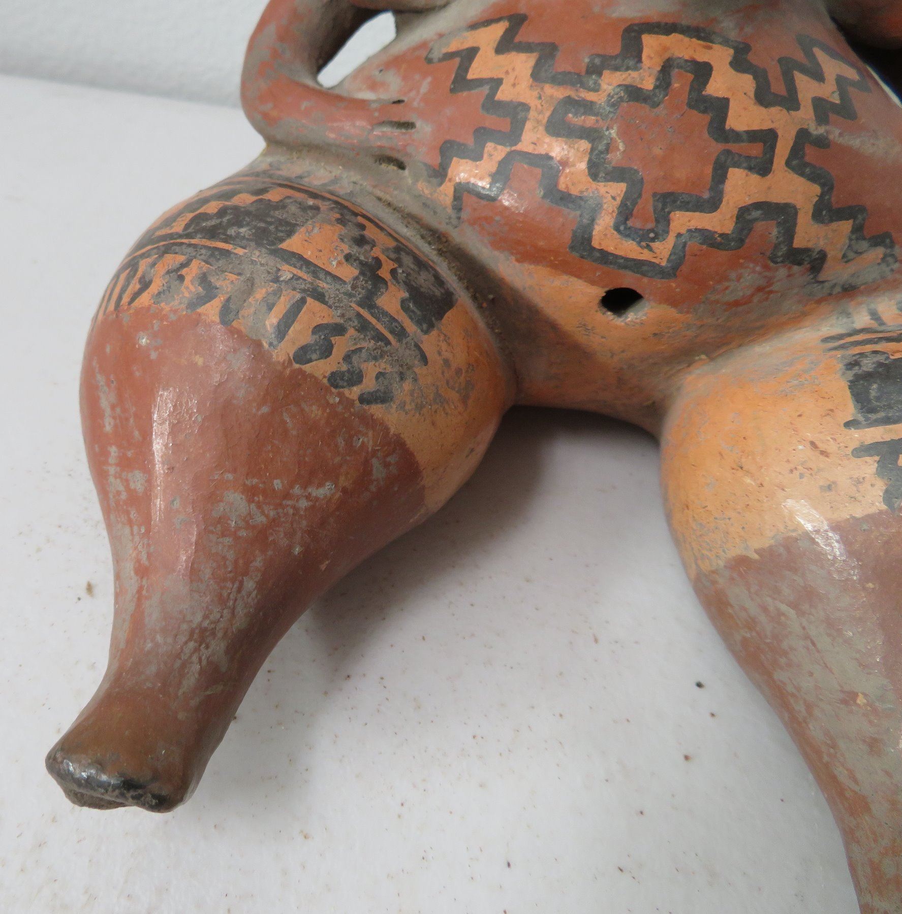 Chupicuaro Figure, pre-Columbian item. Made of clay and paint, the item measures 7" x 5 1/2". Chupicuaro, Mexico. Condition: Right leg broken and glued, see images. Shipping: $34.00 w/insurance and signature, due to size and weight.
