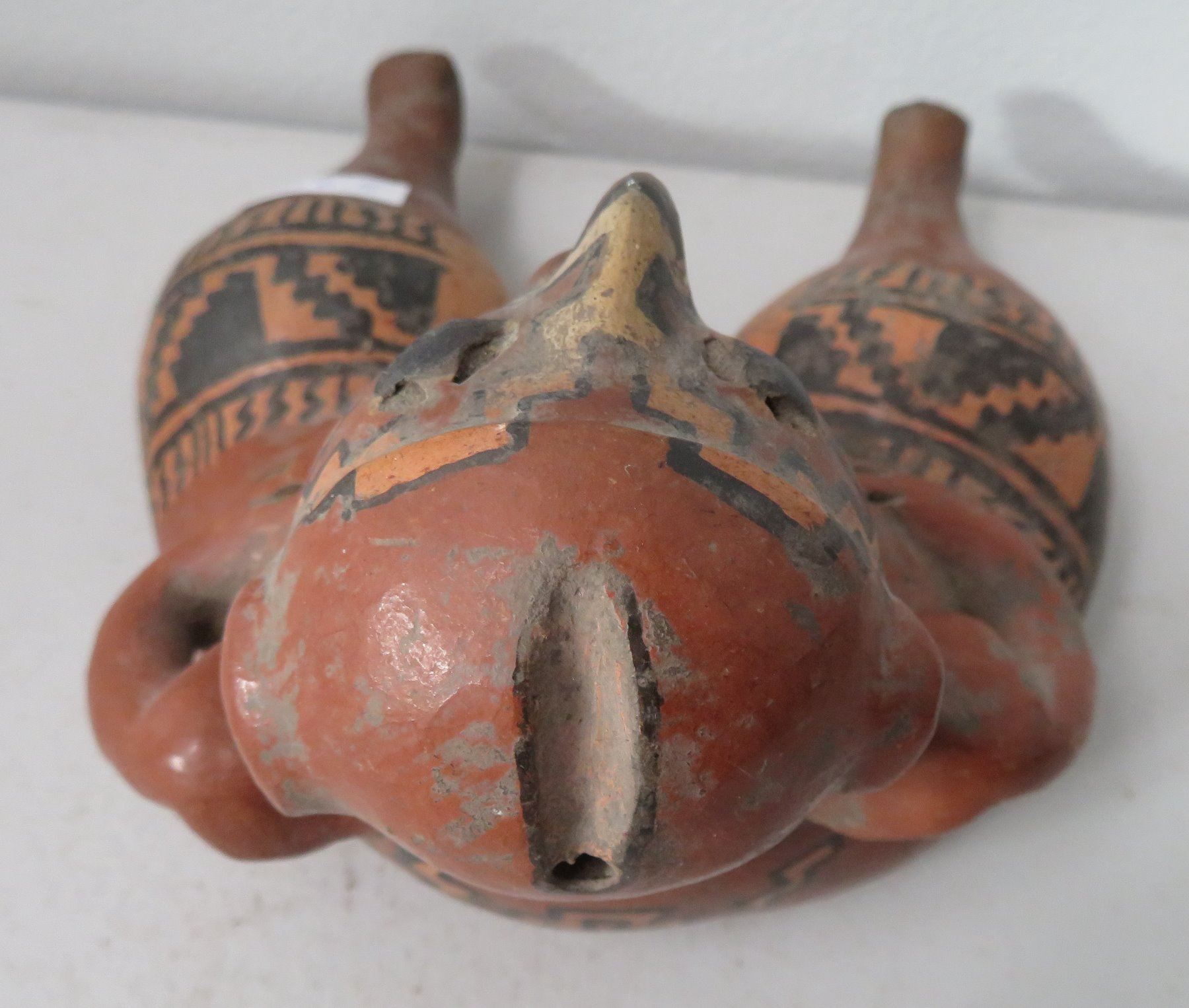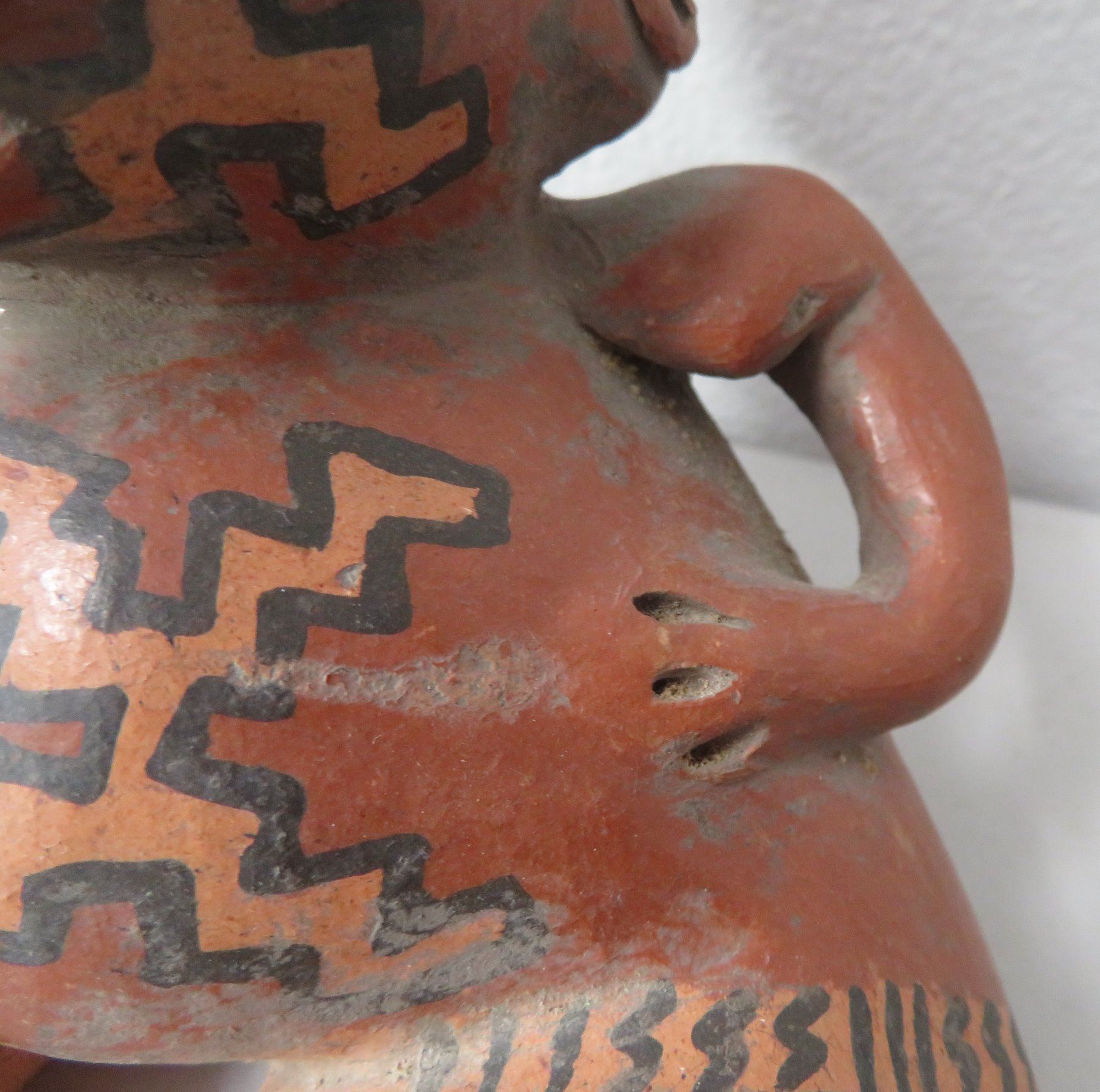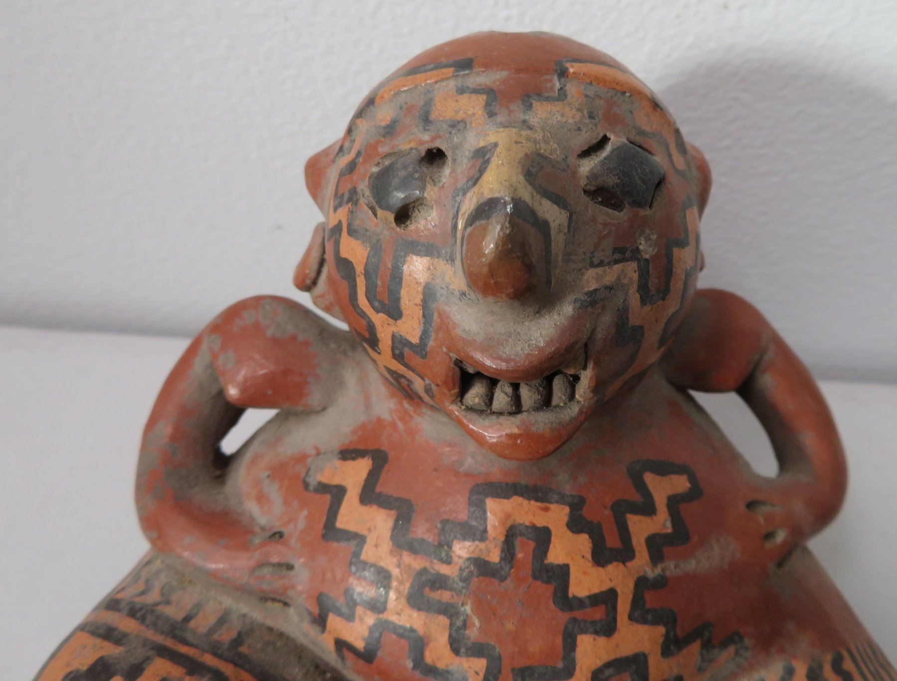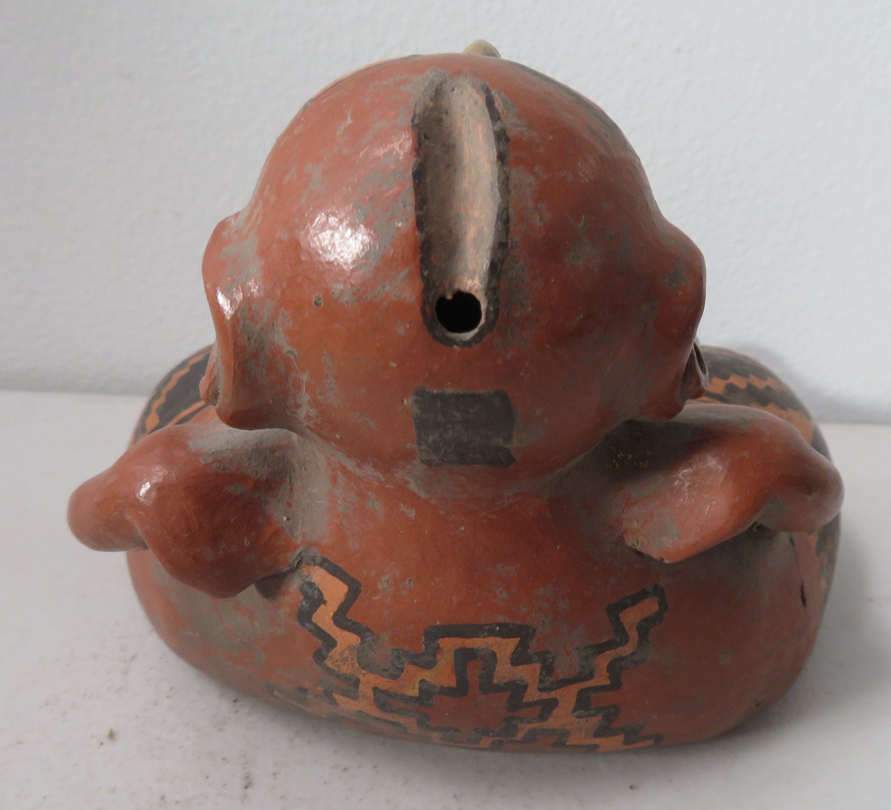 Chupicuaro Figure, pre-Columbian item. Made of clay and paint, the item measures 7" x 5 1/2". Chupicuaro, Mexico. Condition: Right leg broken and glued, see images. Shipping: $34.00 w/insurance and signature, due to size and weight.