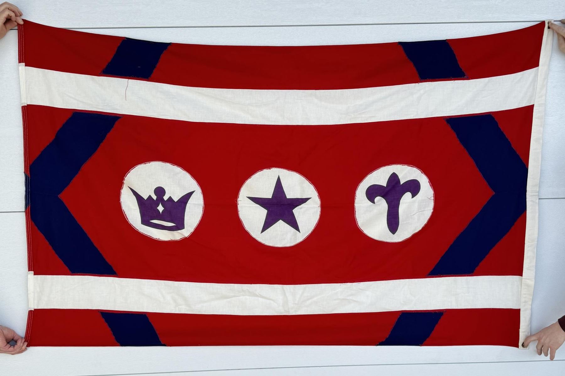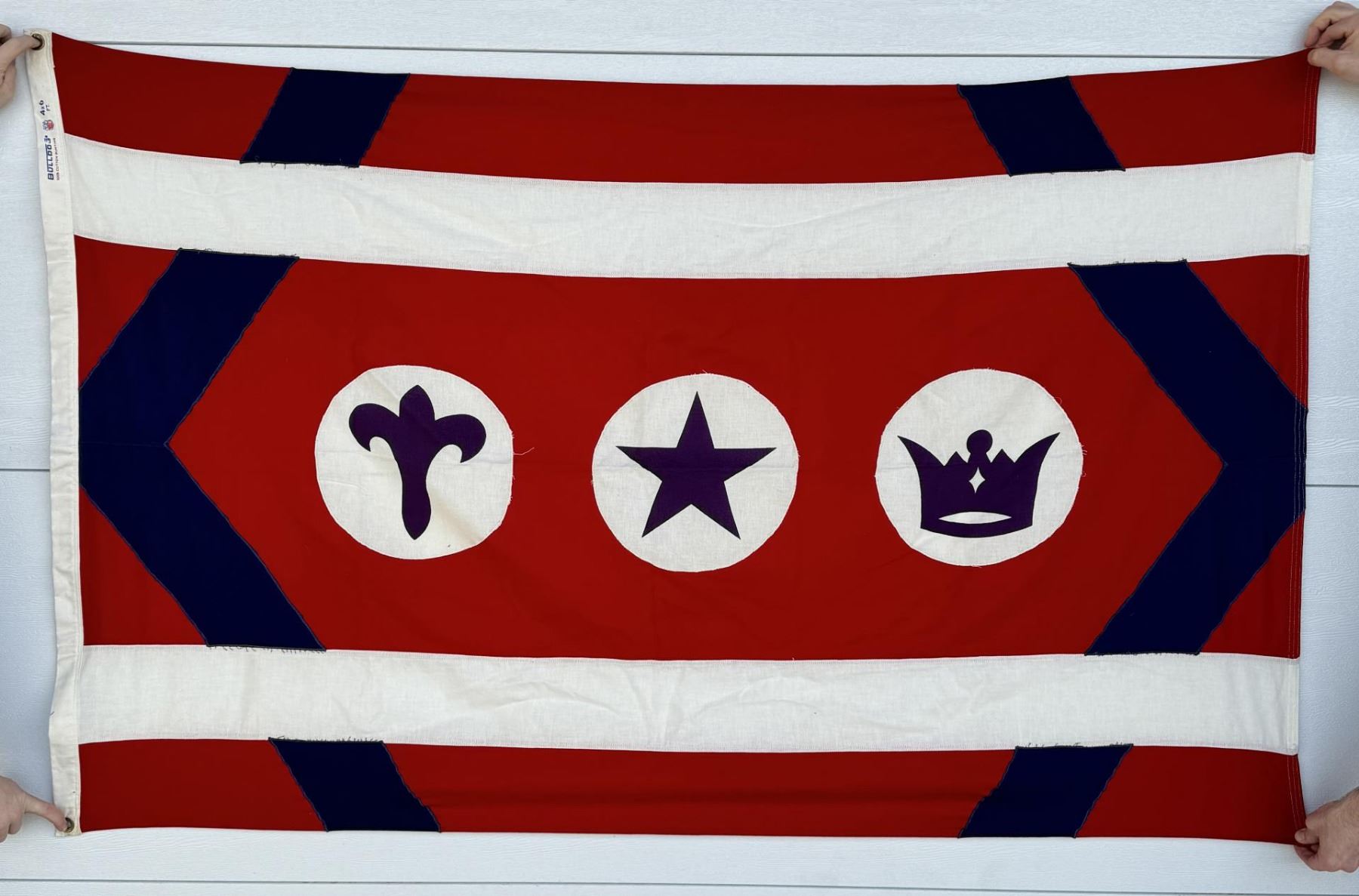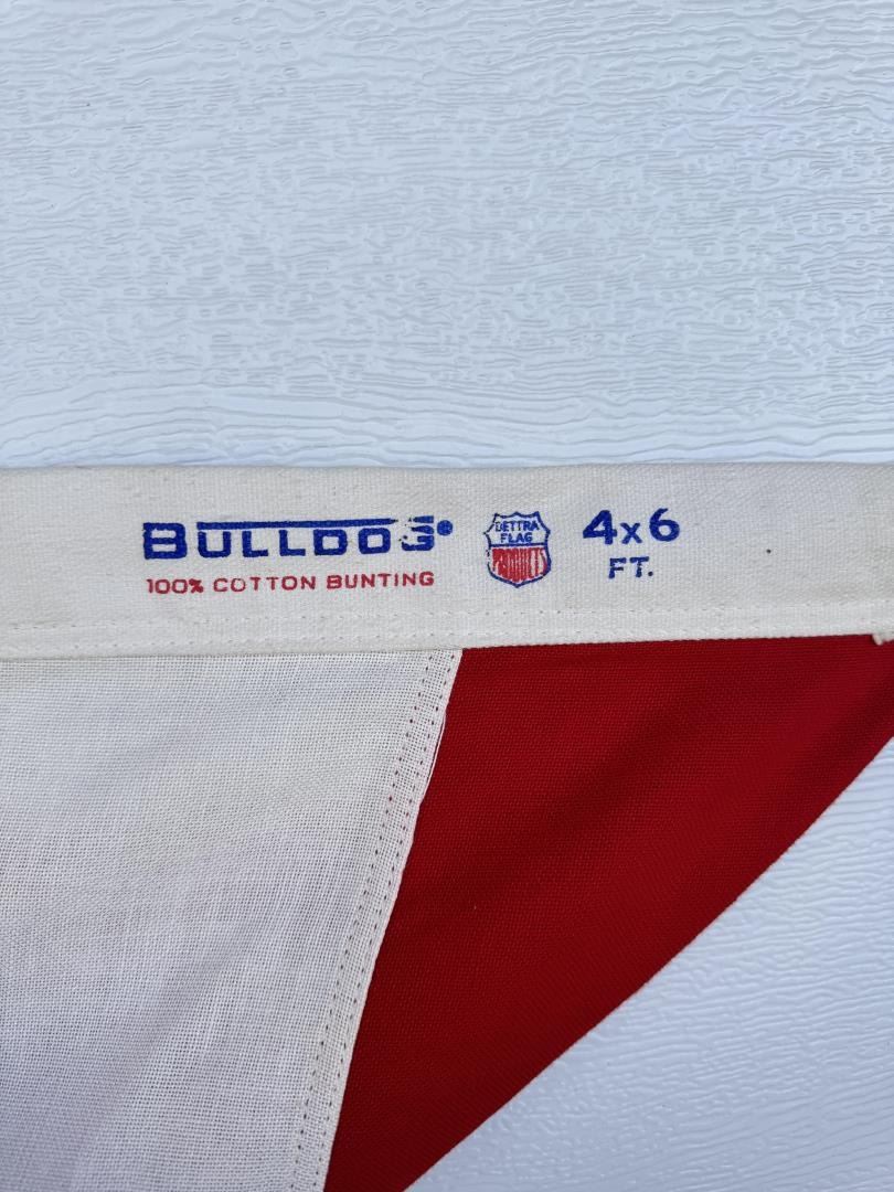 71" by 44 1/2". The church emblems were added by hand to a red and white bunting flag.