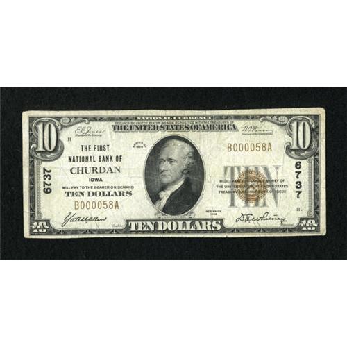 <B>Churdan, IA</B></I> - $10 1929 Ty. 1 <B>The First NB</B></I> Ch. # 6737<BR> The paper is whole and the devices remain bold. <B>Fine.</B></I><BR><BR><b>Shipping:</b> Coins & Currency (<a target="_blank" href="http://www.heritageauctions.com/common/shipping.php">view shipping information</a>)