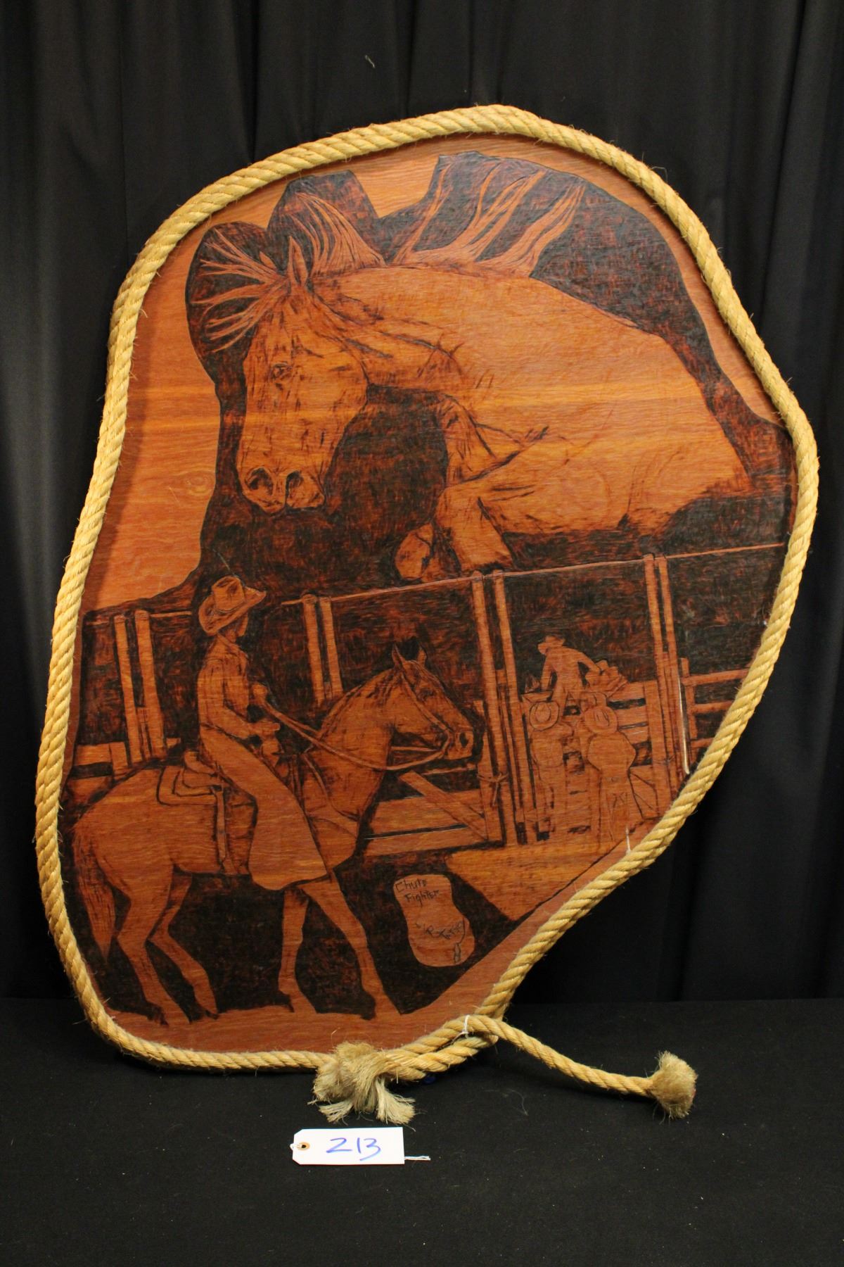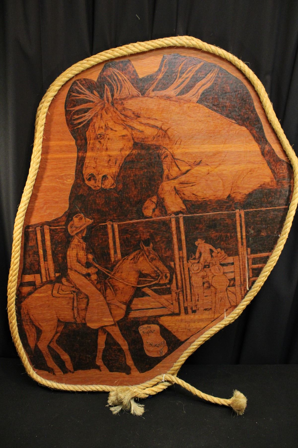 Large wood burning by R. Tatsey. Rope binding. 44" x 33"