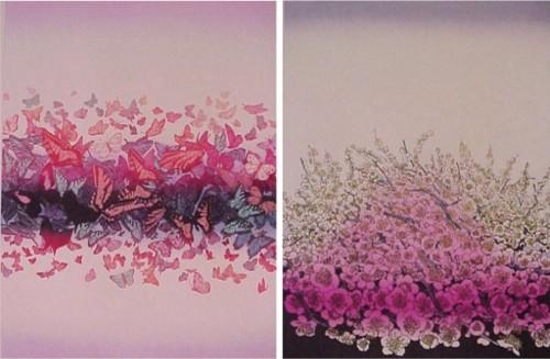 BUTTERFLIES IN SPRING; APPLE BLOSSOMS IN SPRING 1987, two color woodblock prints on embossed paper, each signed in pencil, from the numbered edition 100, images 21 ¾ x 16 ¼”, full margins, soft creases. (2) $200/400