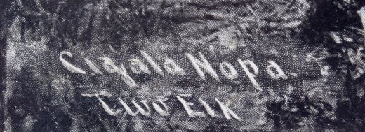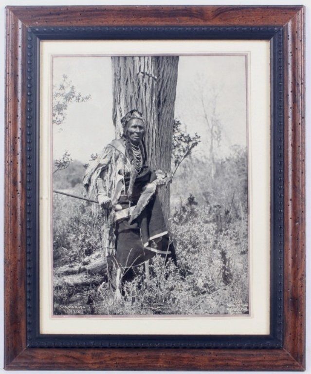 This is an original piece printed and published by Pittsburg Plate Glass Co and is of Ciajala Nopa otherwise known as Two Elk. This image of the Native American was shot by Heyn in 1900. Herman Heyn was an importantportrait photographer in Omaha, Nebraska, from the 1880s through the 1920s. He is nationally noted for more than 500 images he created of Native Americans, mostly Sioux. This piece is in good condition. The imagemeasures 9 3/8"x12 3/8" and the frame measures 14"x17"