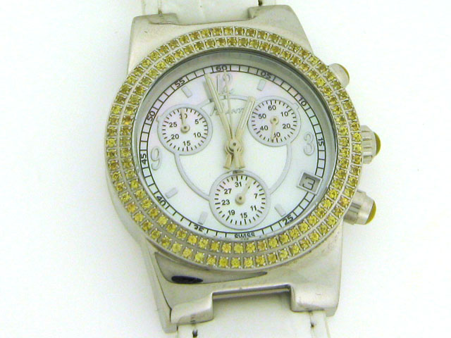 This is a Ciel Polanti Watch with the following features: Mineral Crystal; Mother of Pearl Dial; Swiss-Made Chronograph Movement; Stainless Steel; Yellow Gems on the Bezel; 42mm Case Diameter; 11mm Case Thickness; 32mm Bracelet Width; and Water Resistant