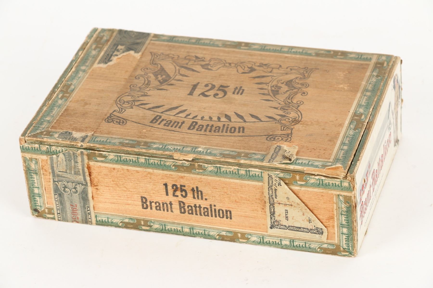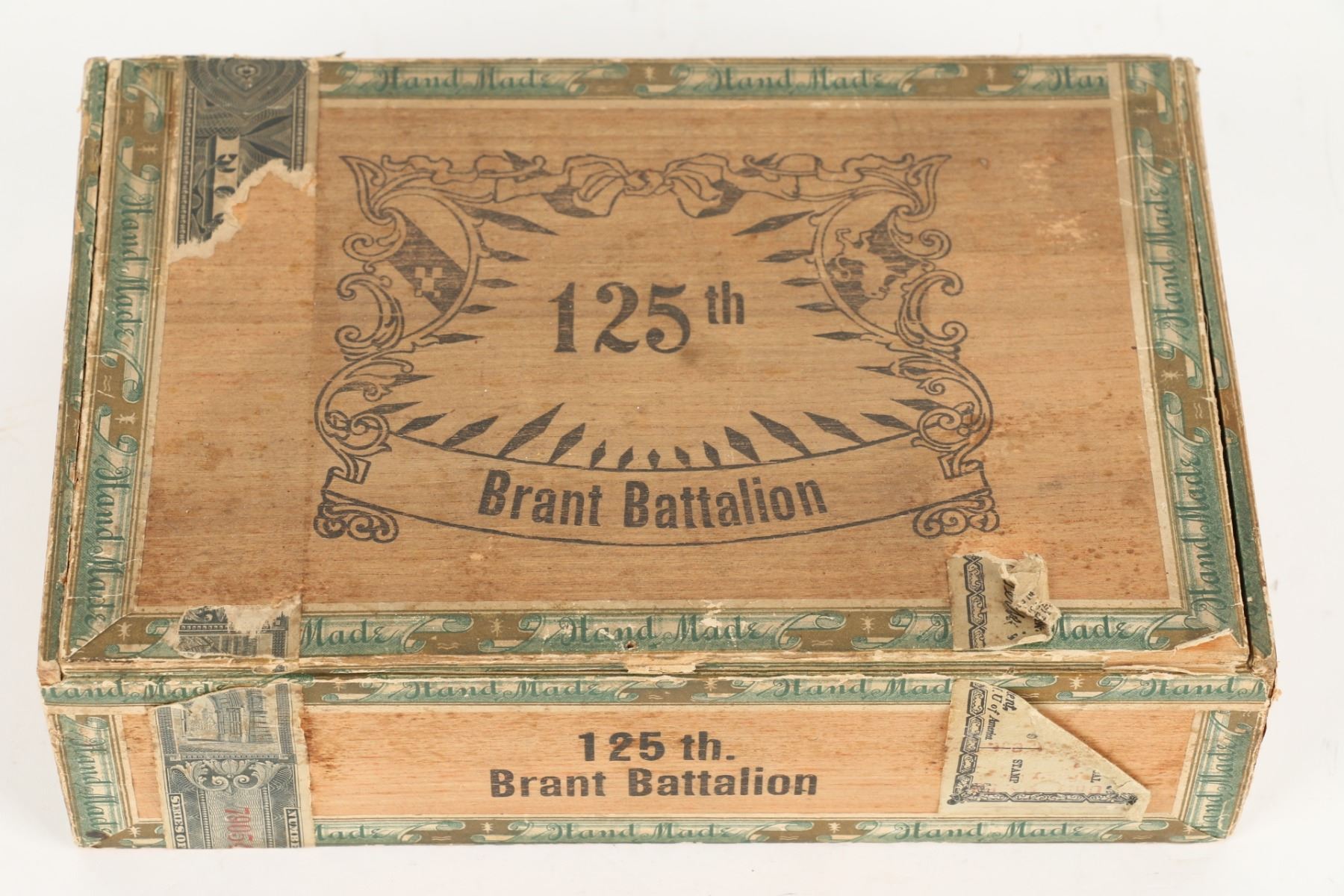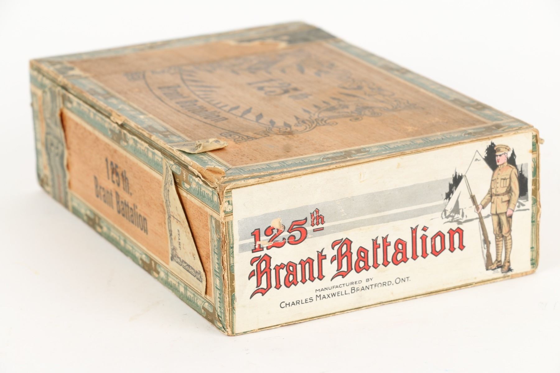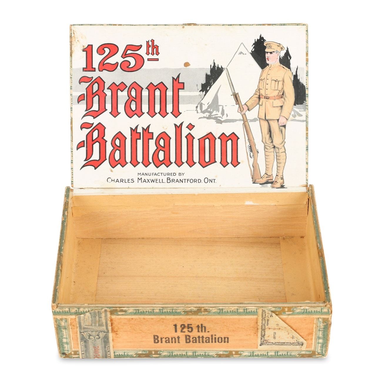 Rare. 125th Brant Battalion cigar box manufactured by Charles Maxwell Brantford Ontario. Condition: Very Good: Retains original tax bands. Loss to the tax bands. Interior image clean and strong. 8.25" x 5.5" x 2.5"