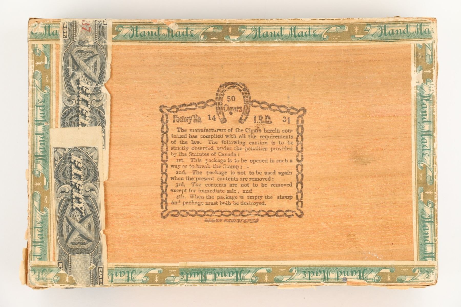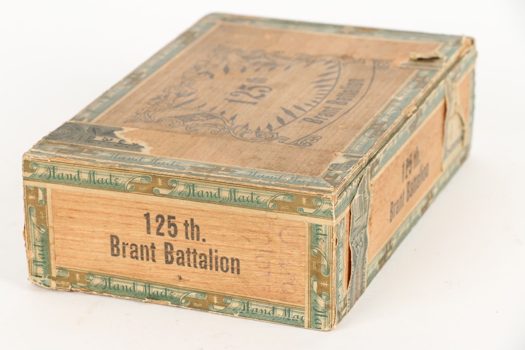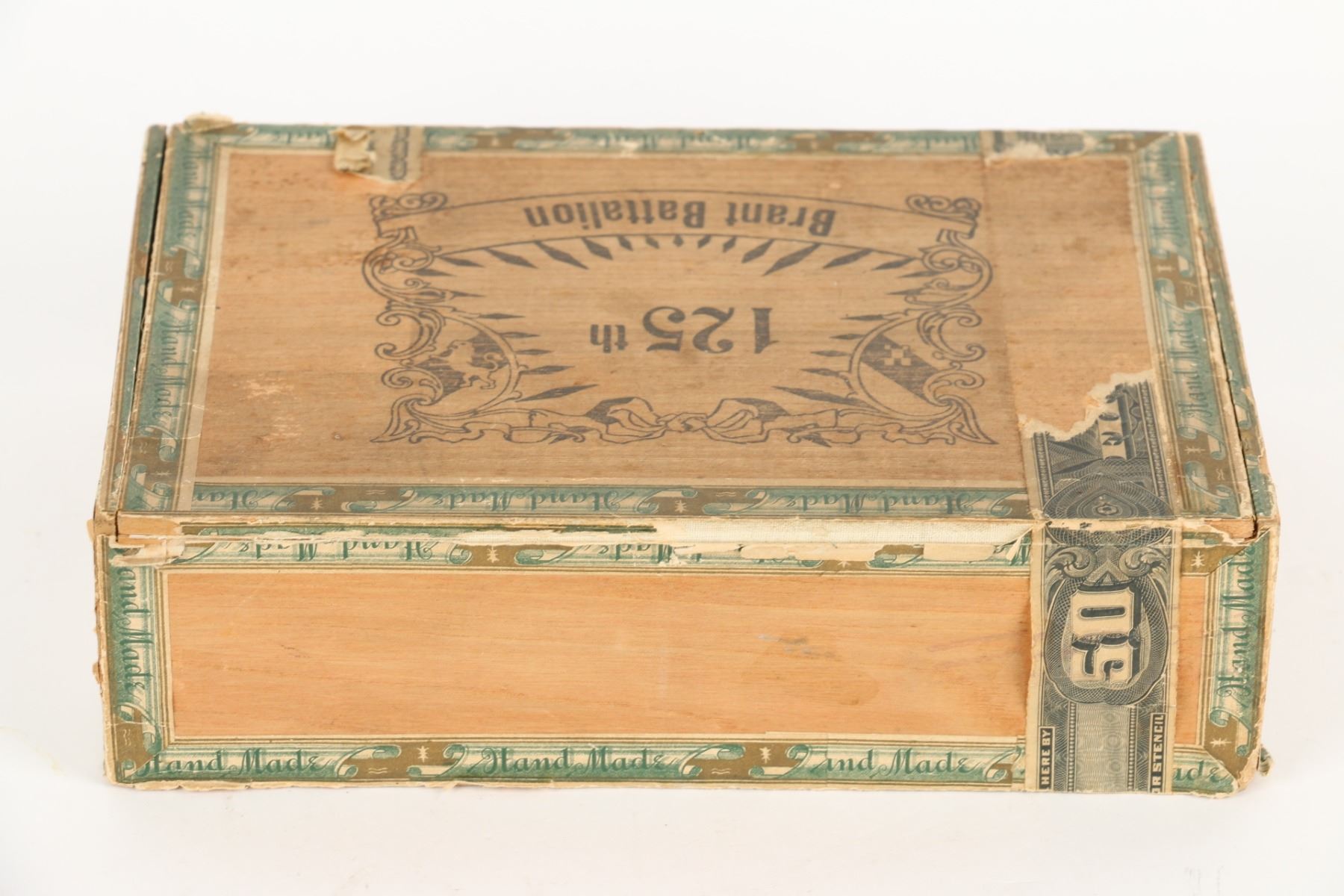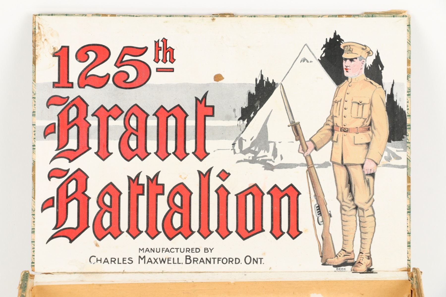 Rare. 125th Brant Battalion cigar box manufactured by Charles Maxwell Brantford Ontario. Condition: Very Good: Retains original tax bands. Loss to the tax bands. Interior image clean and strong. 8.25" x 5.5" x 2.5"