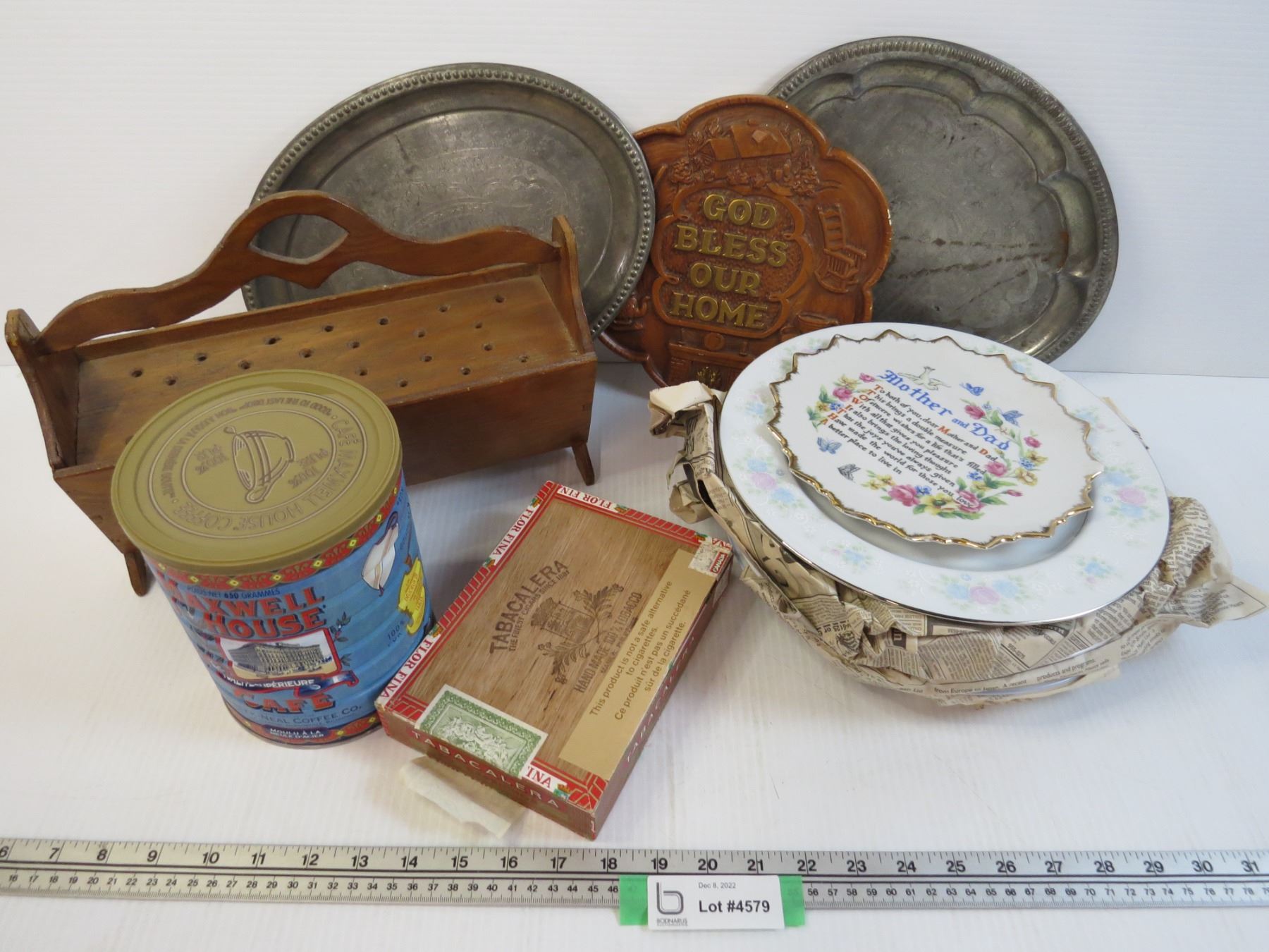 Cigar Box - (2) Metal Trays - (7) Assorted Plates - (2) Wall Plates - Coffee Tin - Homemade Wooden Holder?