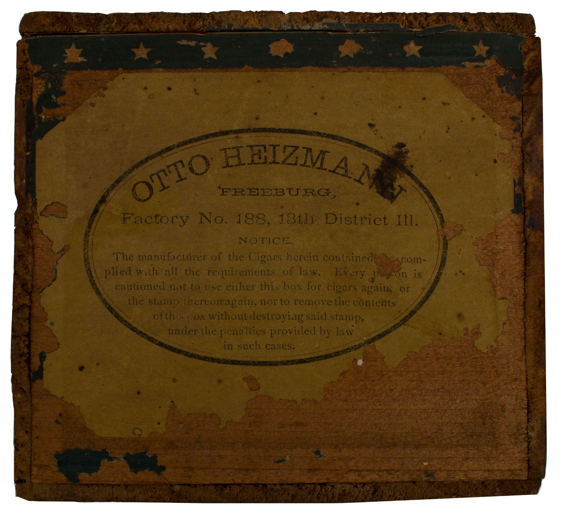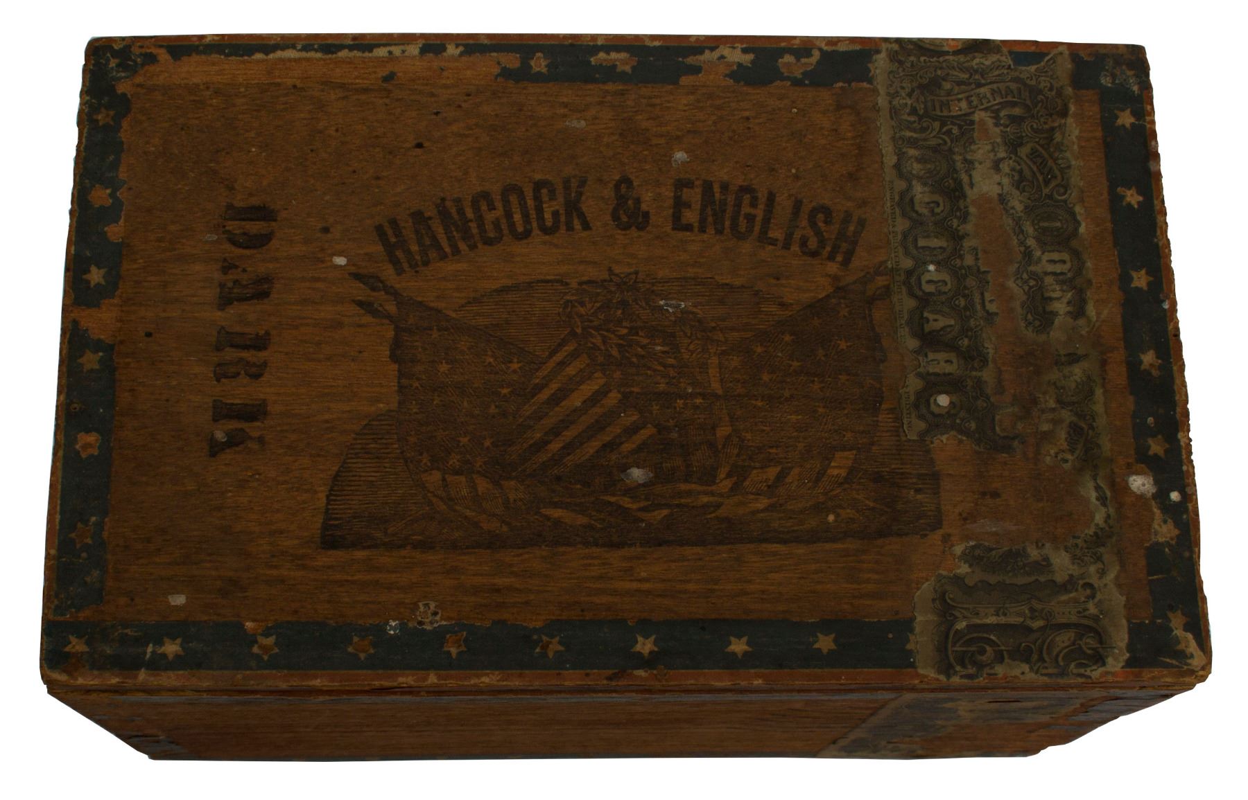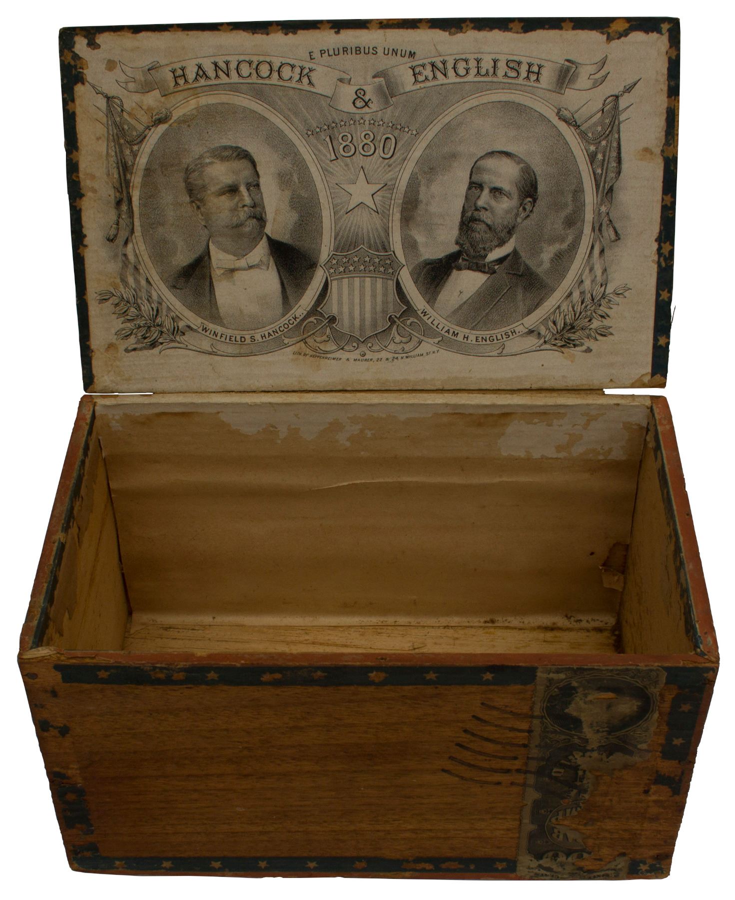 Cigar box for the 1880 Presidential election, championing Democratic candidates Winfield Hancock and William English, who narrowly lost to Republicans James Garfield and Chester Arthur. Wooden box is decorated with Hancock & English on almost all sides and features a label from cigar manufacturer Otto Heizmann on the side panel. As a heroic veteran of Gettysburg with impeccable integrity, Winfield Hancock was the Democrats' most promising candidate to defeat the Republicans since 1868, having been out of power all those years after the controversial Presidency of Andrew Johnson. It was not to be, however, and the Democrats didn't gain control of the White House until 1893 with the election of Grover Cleveland. Cigar box measures 8'' x 5'' x 4.5'' tall. Age wear and hinged top starting to loosen, overall in very good condition.