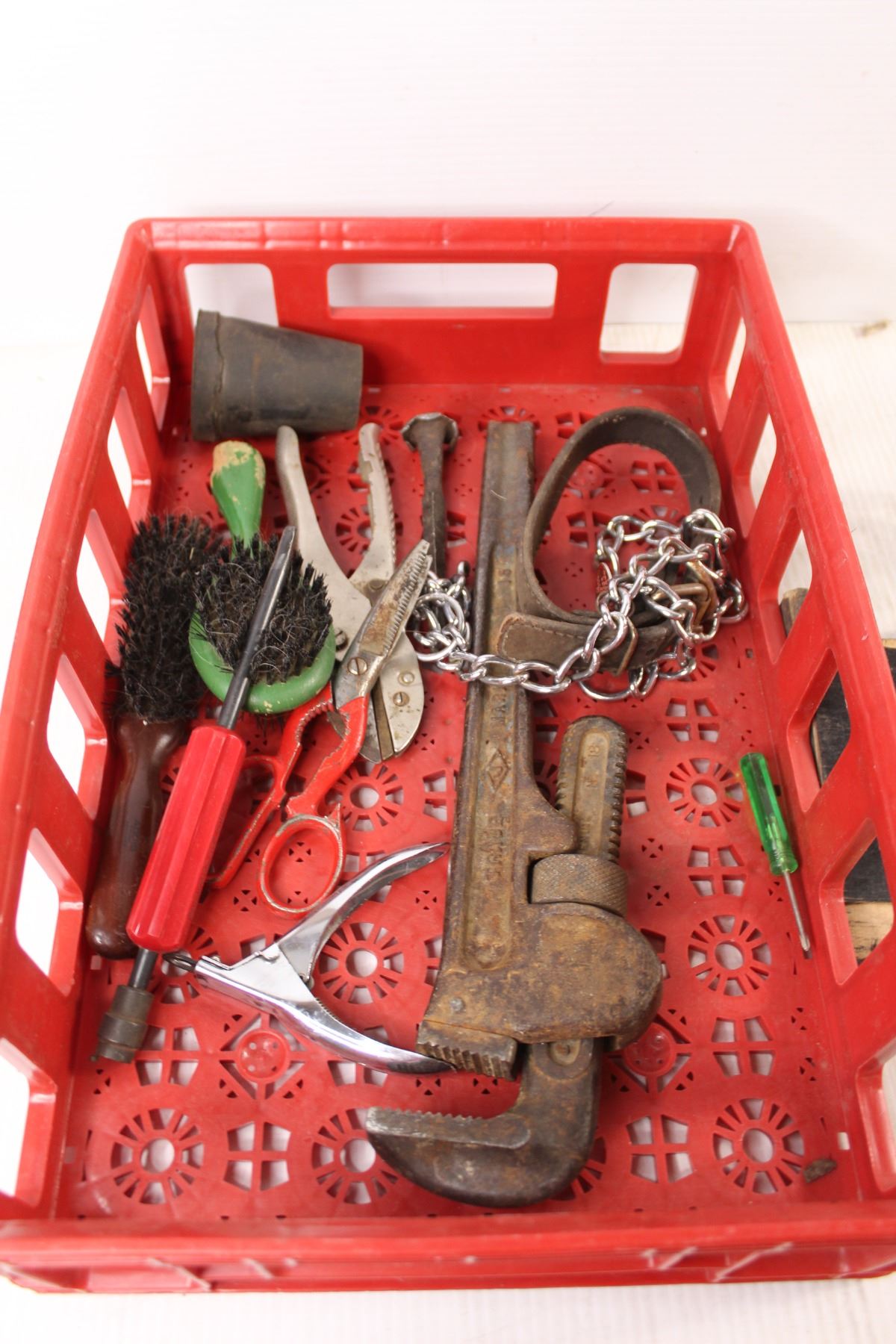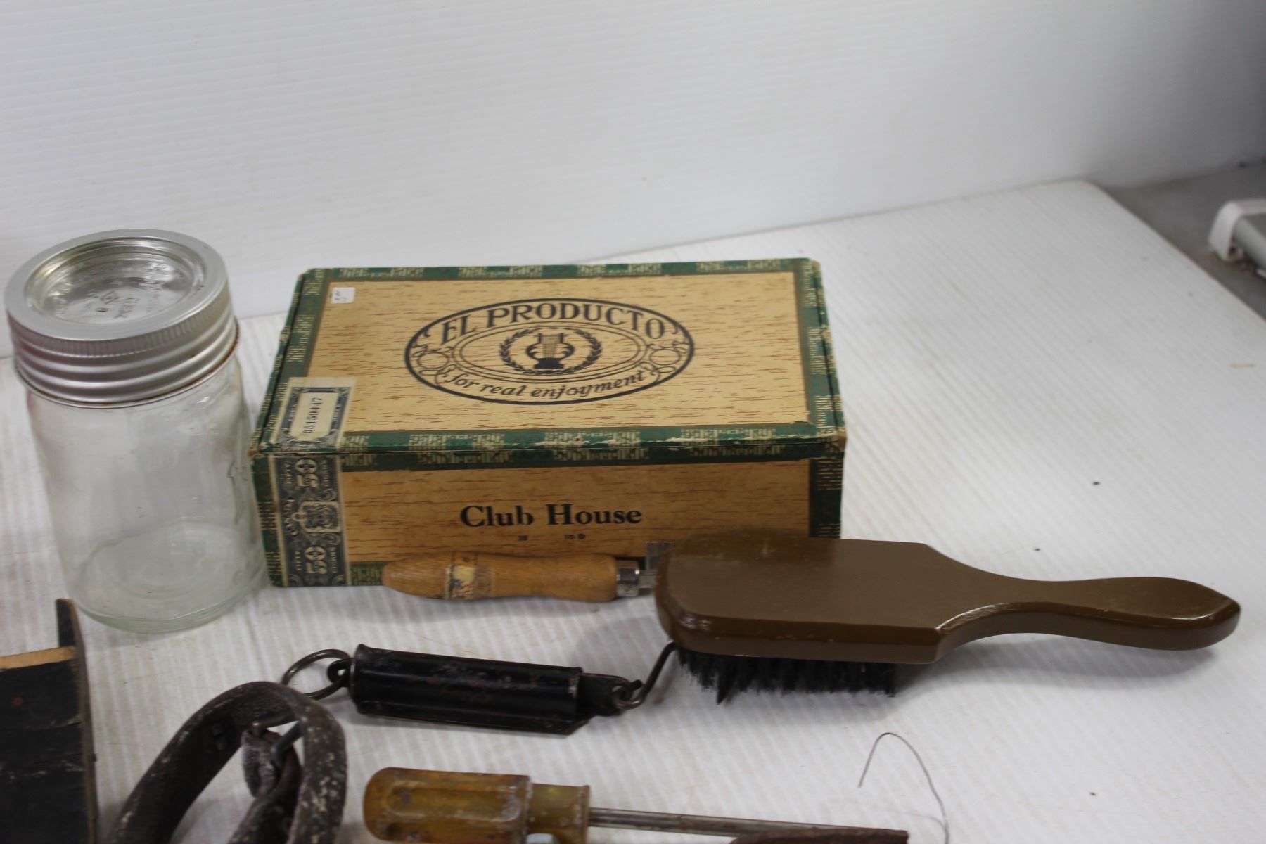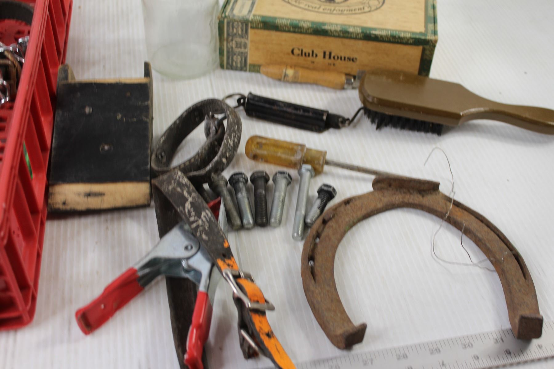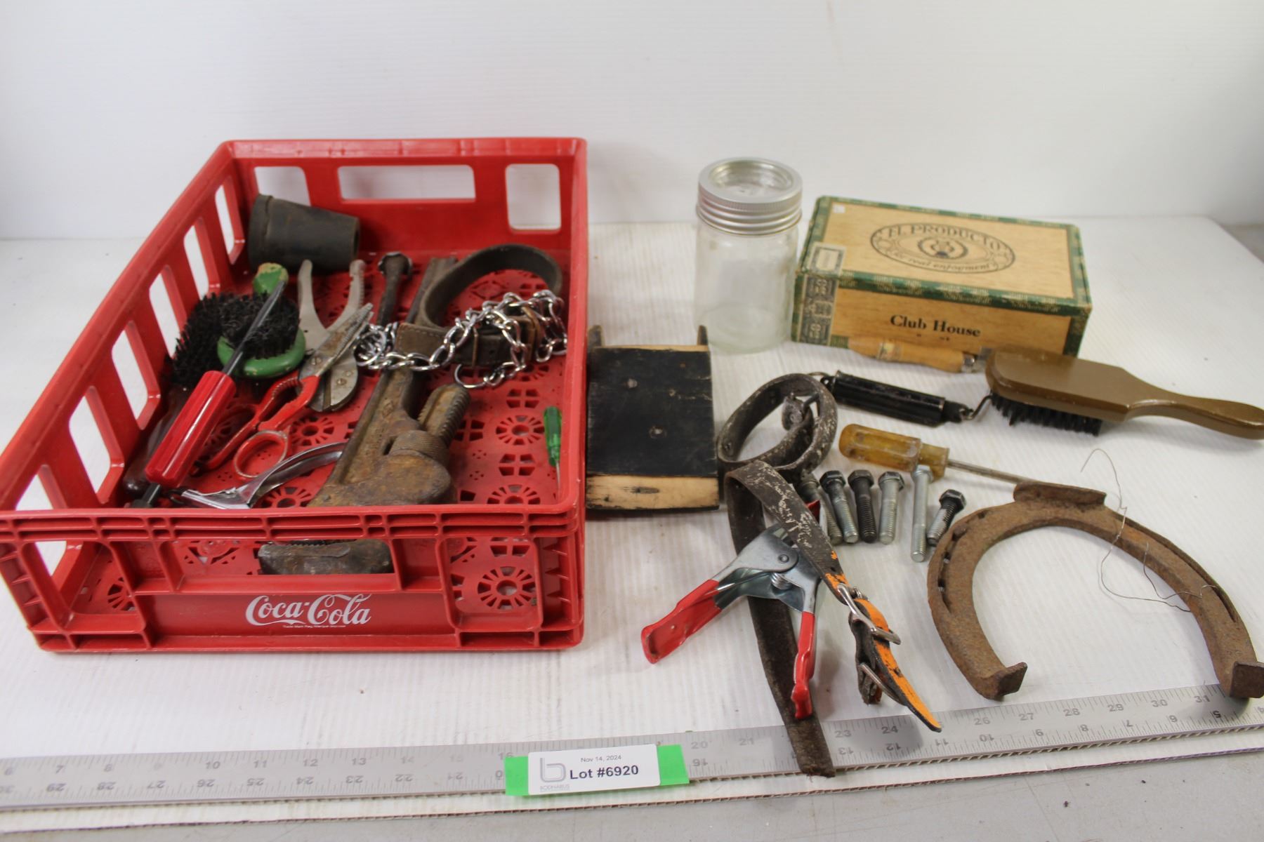 Cigar Box, Horseshoe, Brush, Crate, Assorted Tools