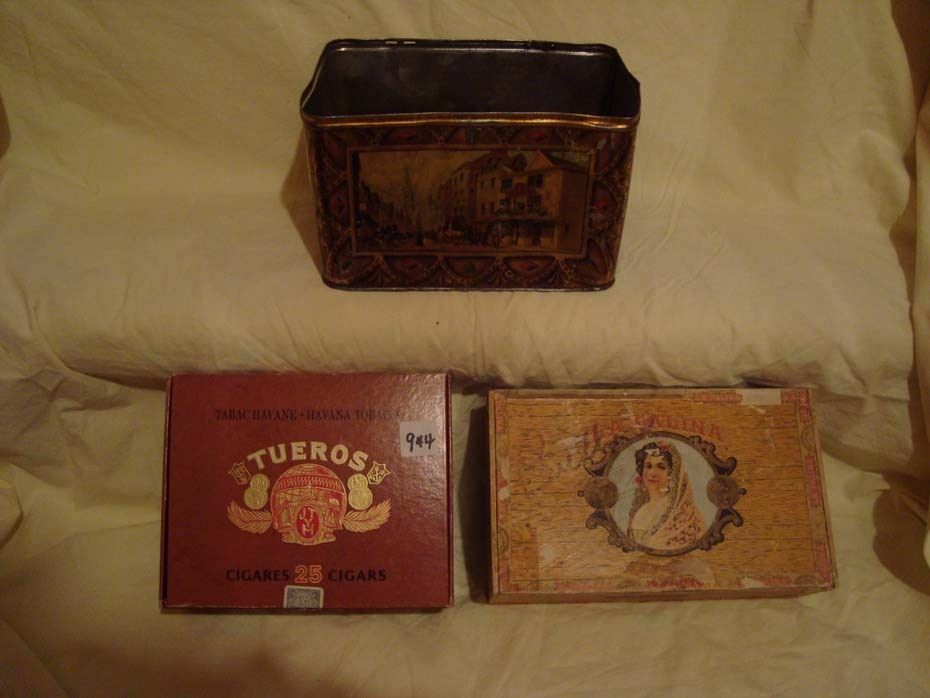 Cigar Boxes (2) and Old Mustard Tin (1)