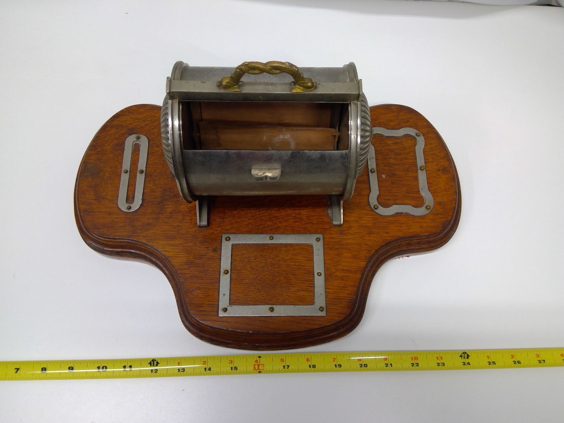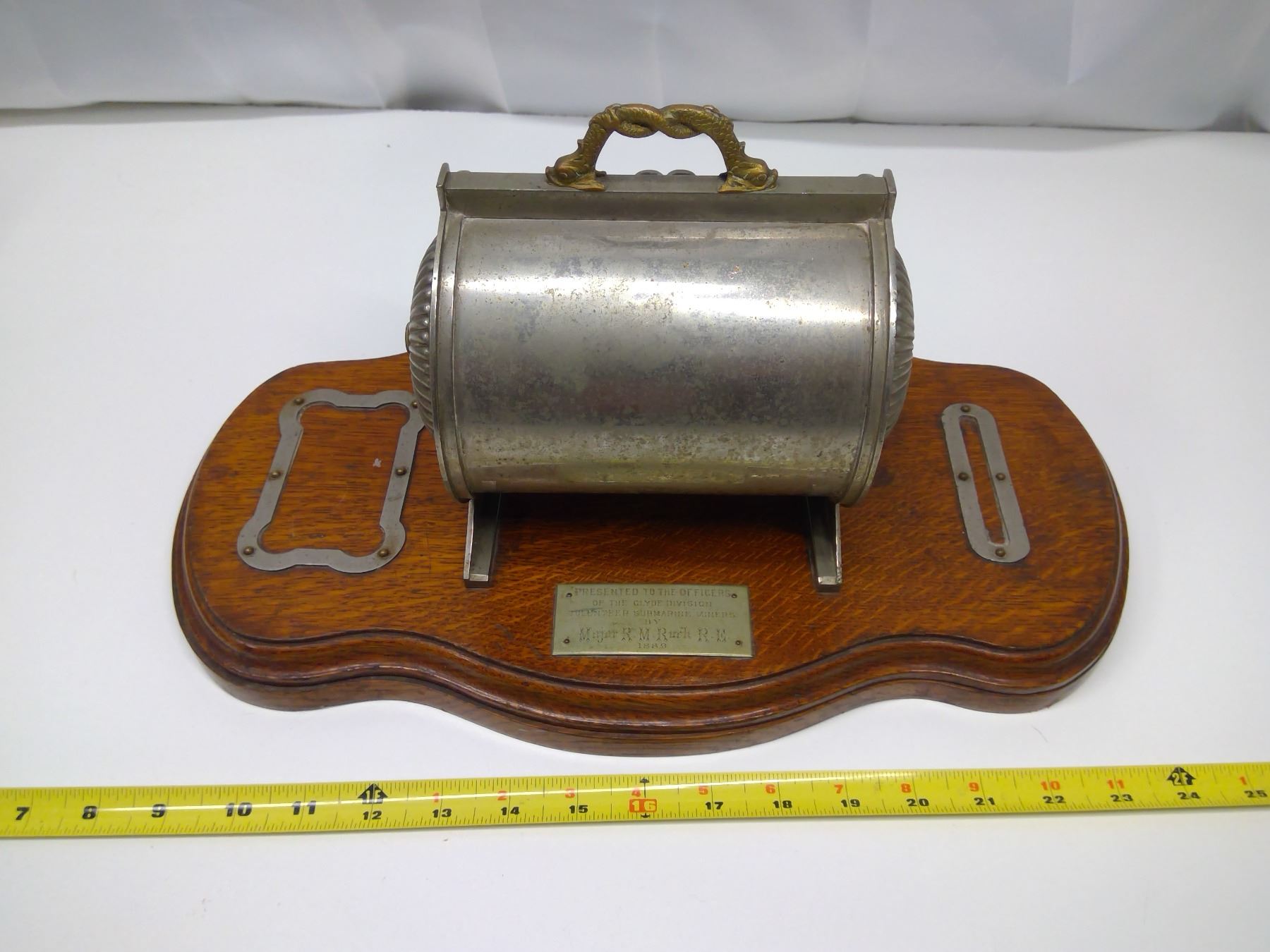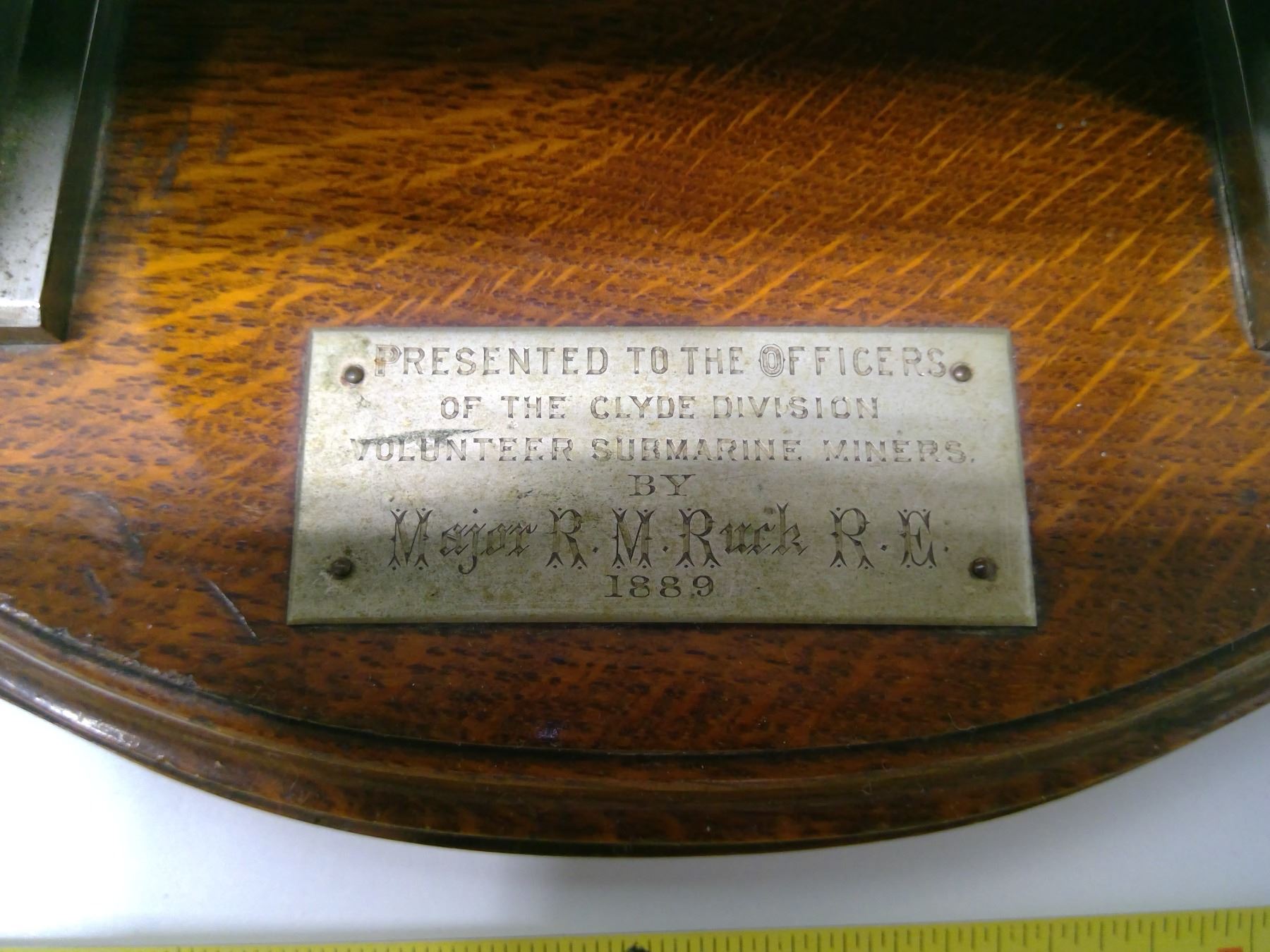 Cigar Case presented to Clyde Division Submarine Miners in 1889 by Major R. M. Ruck; 16” long x 9 in. wide x 8” high —on an oak base