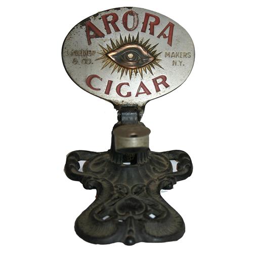 Cigar Cutter - Arora - E. Kleiner & Co. Patent dates of 02 & 08.  One hole.  Sits on decorative 6" x 8.25" iron base and stands 7.5" H.  Original condition.