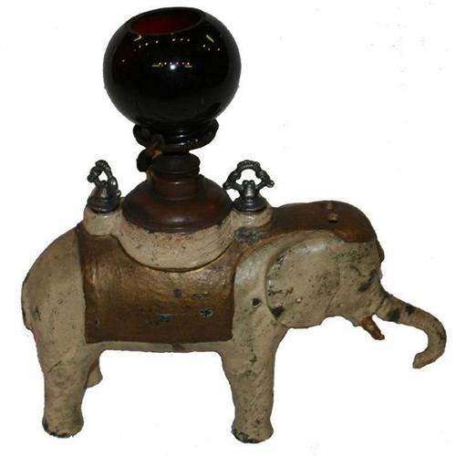 Cigar Cutter-Lighter combination in shape of elephant. Press nose for lever action for two holes. Two wands. Ruby colored glass globe. Very nice old paint. Approximately 11" H, 11" from nose to tail, and 3" wide.