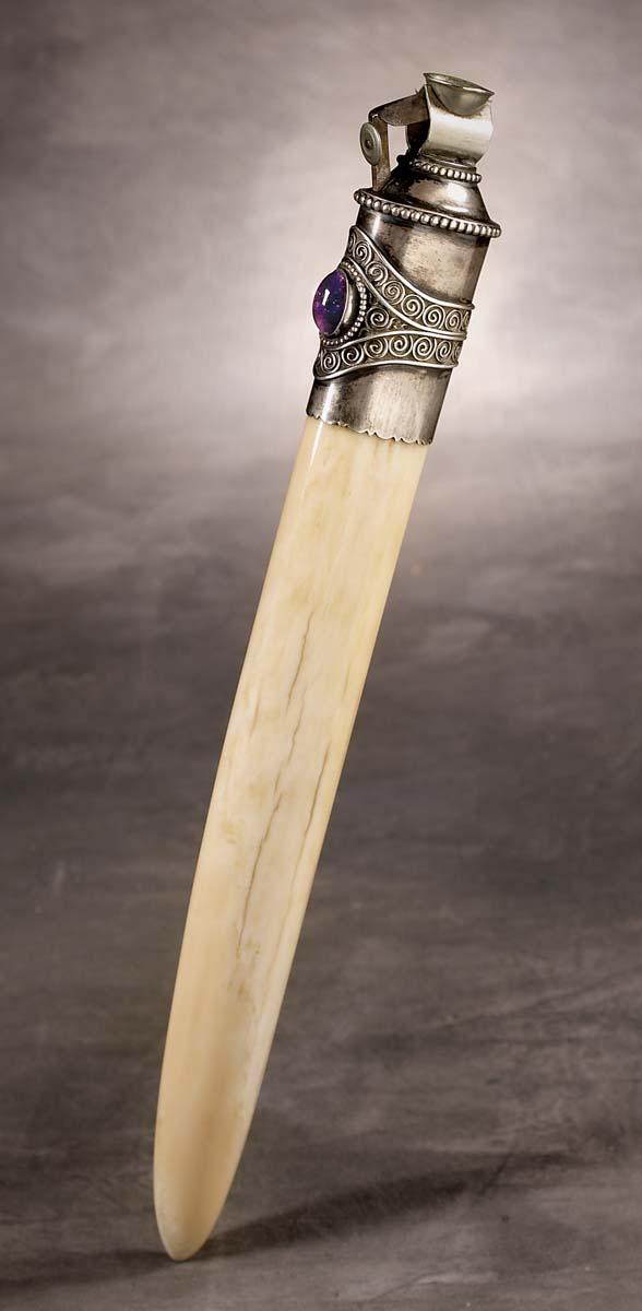 Ivory handle 12" total length, 9" of ivory. Silver plated cutter and tip which has purple set stone