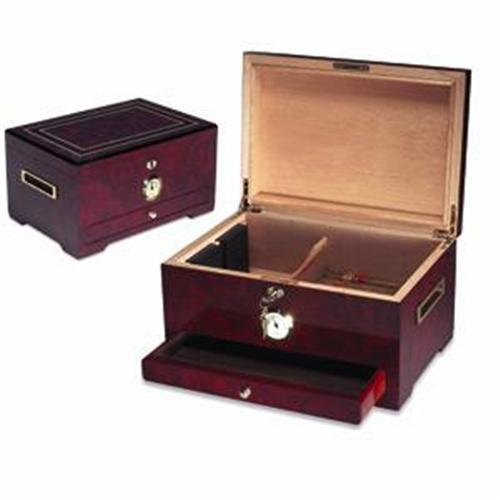 This beautiful 100 Cigar Humidor is made in a Burlwood Finish with Scrolled Inlaid Designs. It includes a Humidification System and Exterior Hygrometer. This is a great Gift for that favorite Cigar lover in your life.
