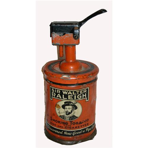 Sir Walter Raleigh Cigar Lighter - sits upon the top of the familiar Sir Walter Raleigh Smoking Tobacco Can. Lighter has 4" D and stands 10" H. Can has numerous dings, stains, and scratches. Sold AS IS,