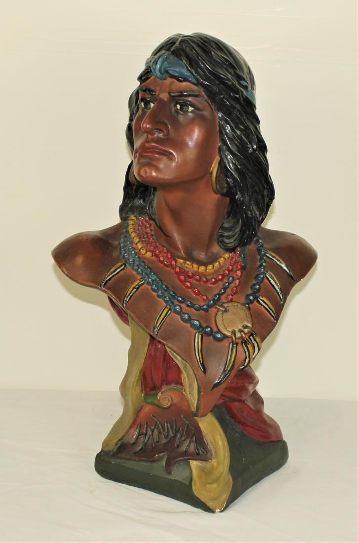 Majestic cigar store advertising fixture, chalk bust of proud indian, showing great original color and condition. Standing 20" tall.