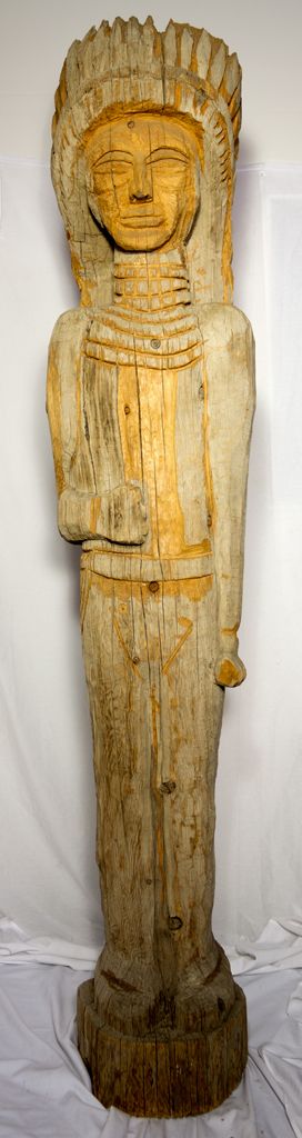 From Lone Pine, CA. This hand-carved folk art Indian is 7` 4" tall, unpainted, and carved out of what appears to be pine. -60289