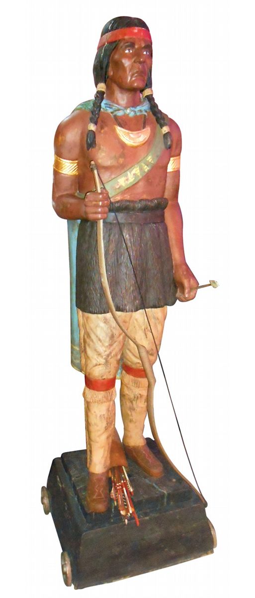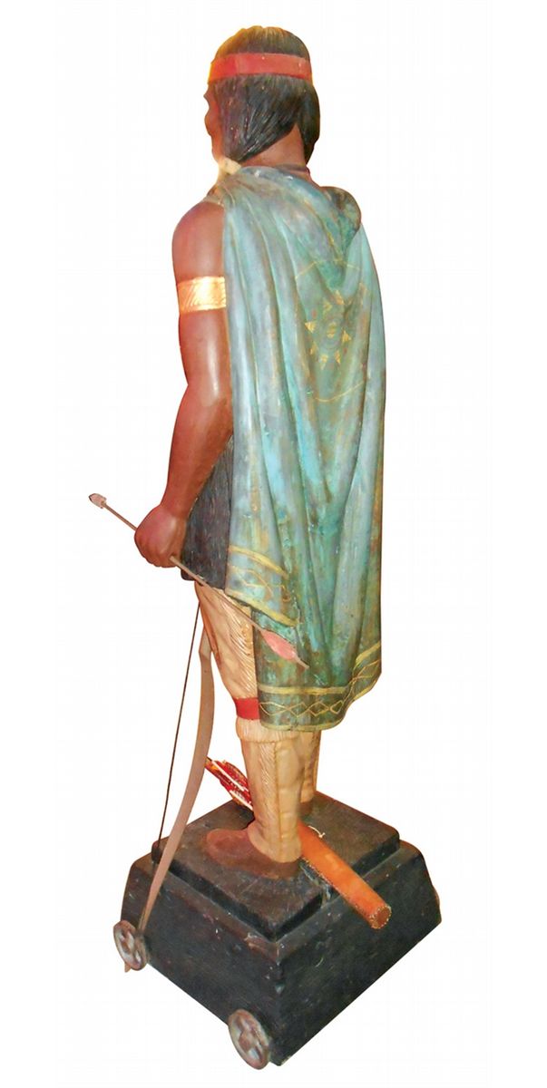 Cigar Store Indian, carved Indian Brave w/cape, bow in one hand & arrow in other, complete w/additio