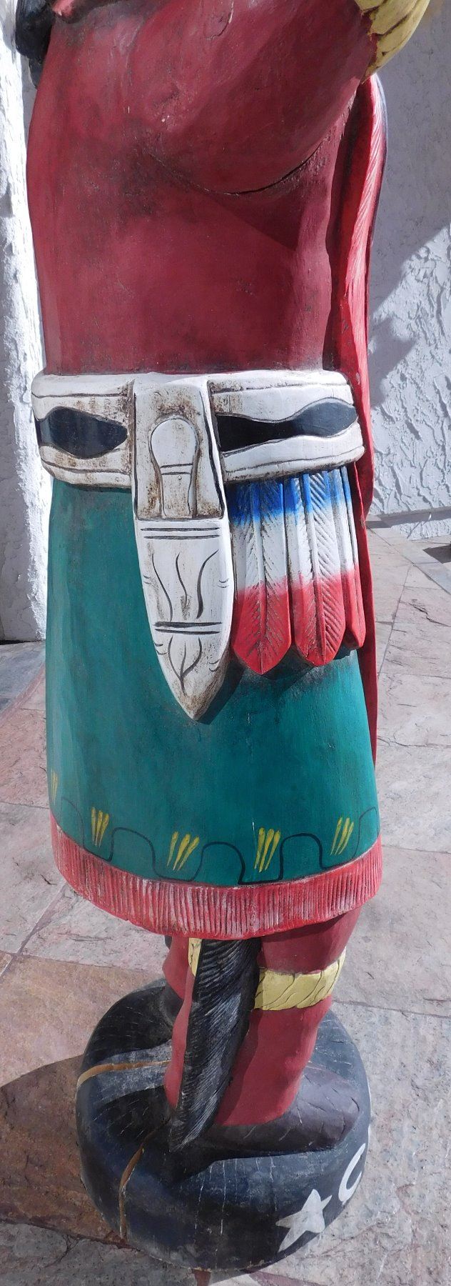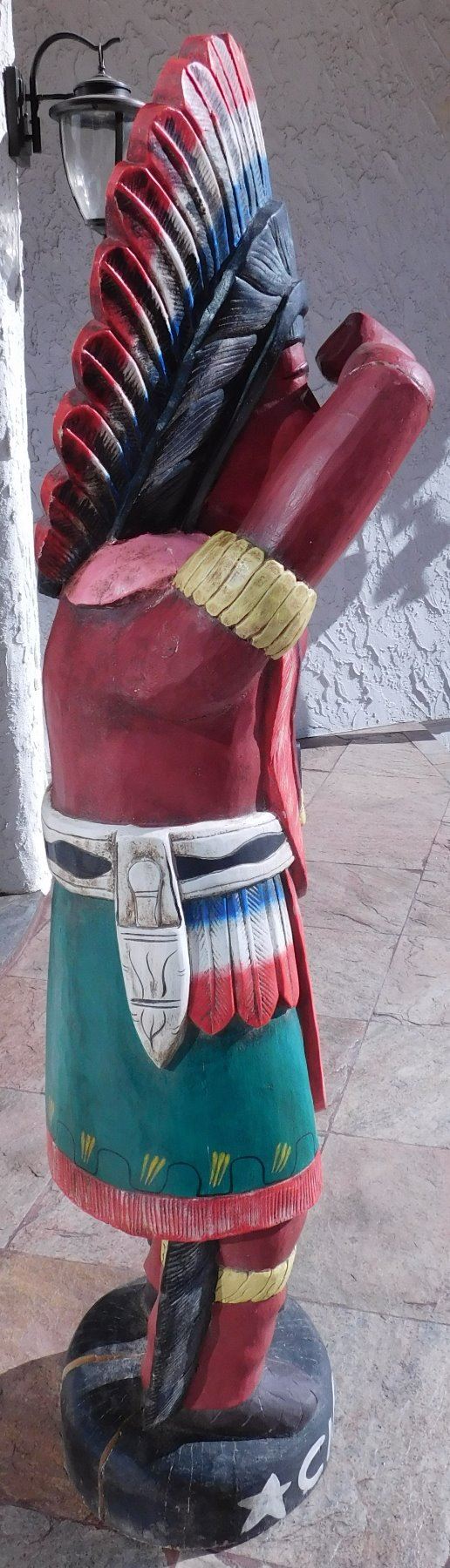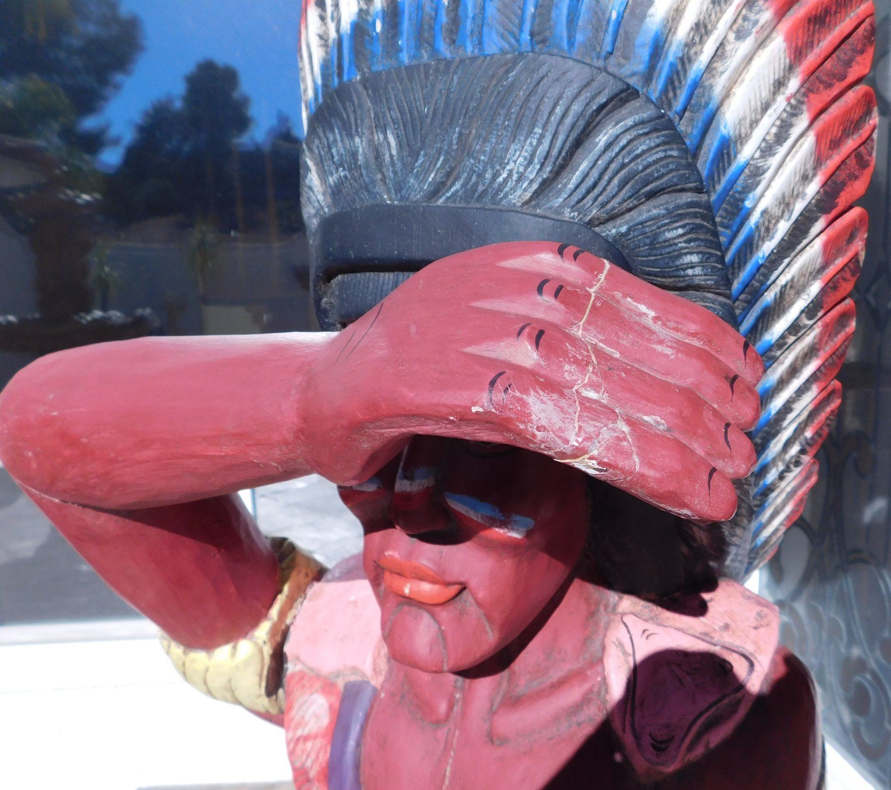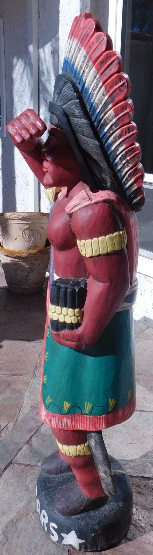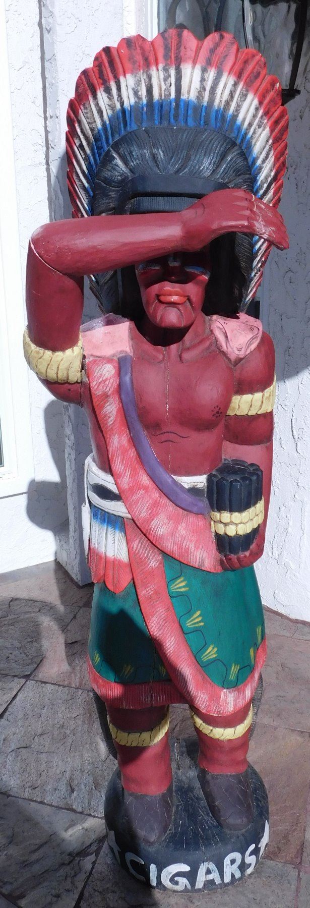 Cigar Store Indian, c. 1950s. Made of wood and paint, the item is 5' tall. Southwest USA. Condition: No known restoration beyond fingers being reglued on hand, see images. Shipping: $100.00 USA estimate only, w/insurance and signature.