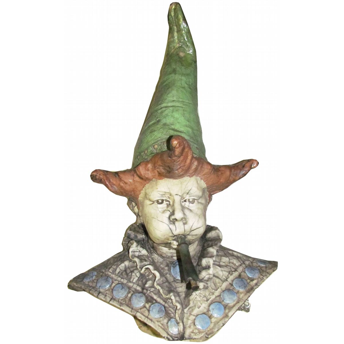 Cigar Store Outdoor Stone Bust, "Jester". Original enamel paint, hung from chains on the outside wall of a Cigar Store. Damage to cigar tip and tip of hat otherwise good condition. 38 X 22 X 13 inches.