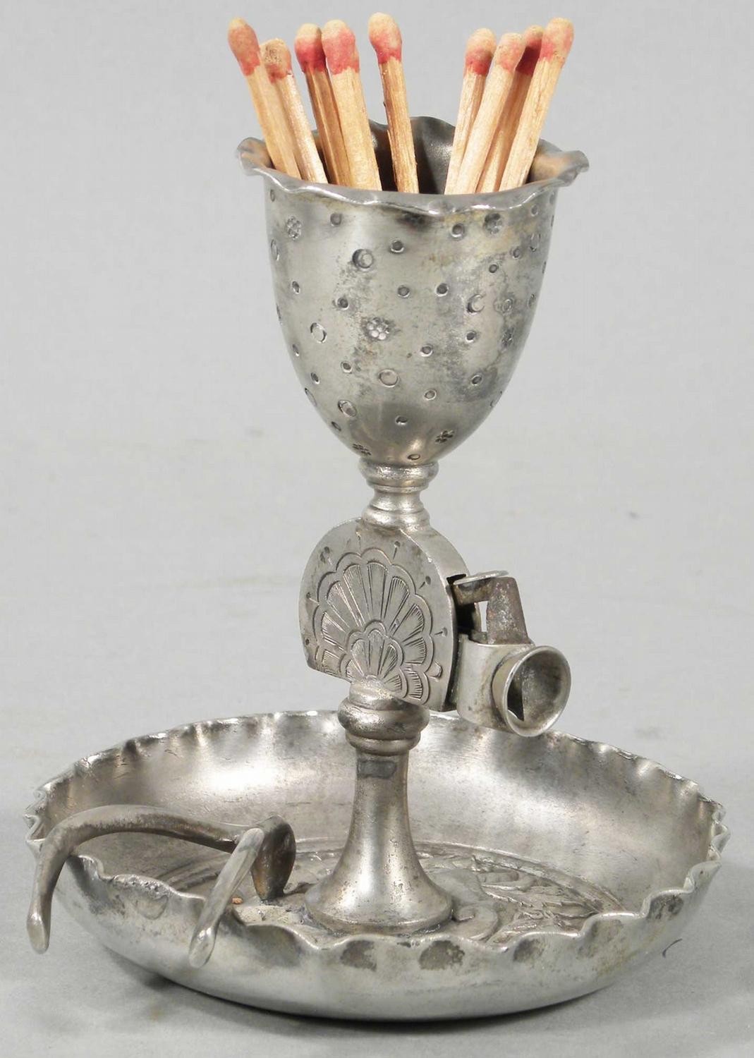 Silver Plated Cigar Tip Cutter Match Holder and Ashtray with wishbone motif. Excellent condition. 4 1/4 inches tall.
