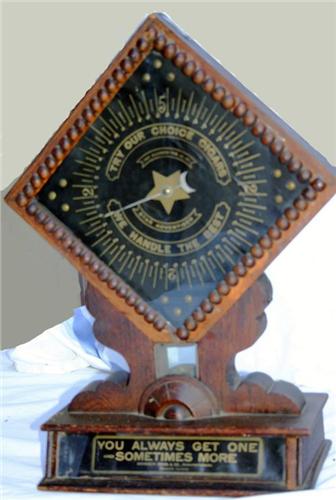 “You Always Get One” Cigar Trade Stimulator made by Drobis Brothers. Graphics are good. Mirror on back is beginning to show wear. Placed on counters to increase cigar sales. Circa 1900.