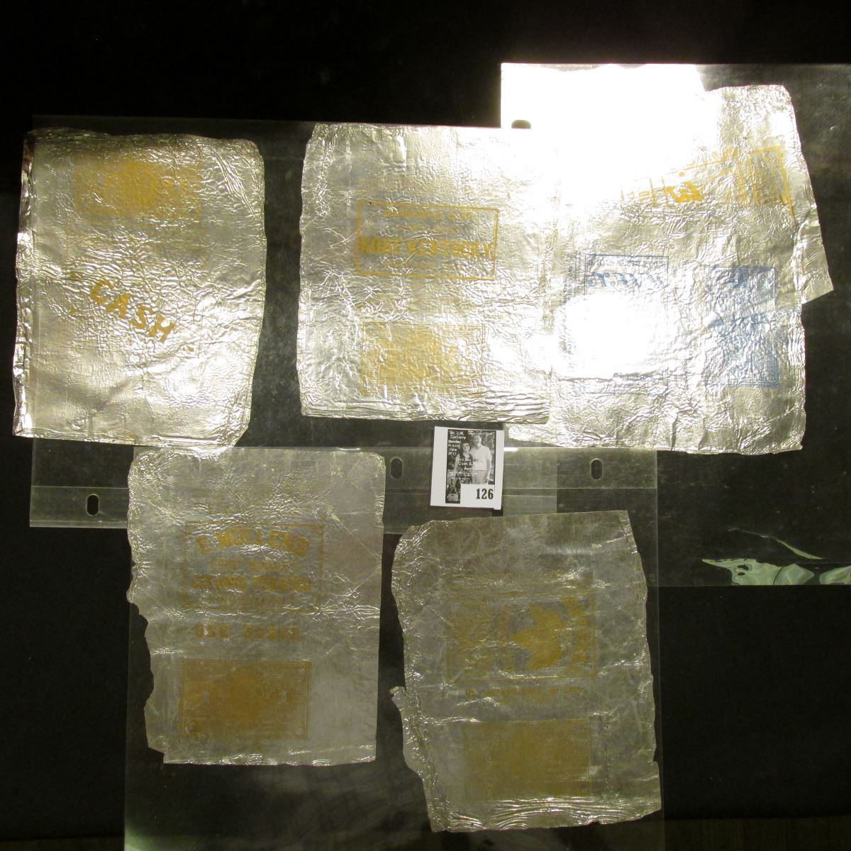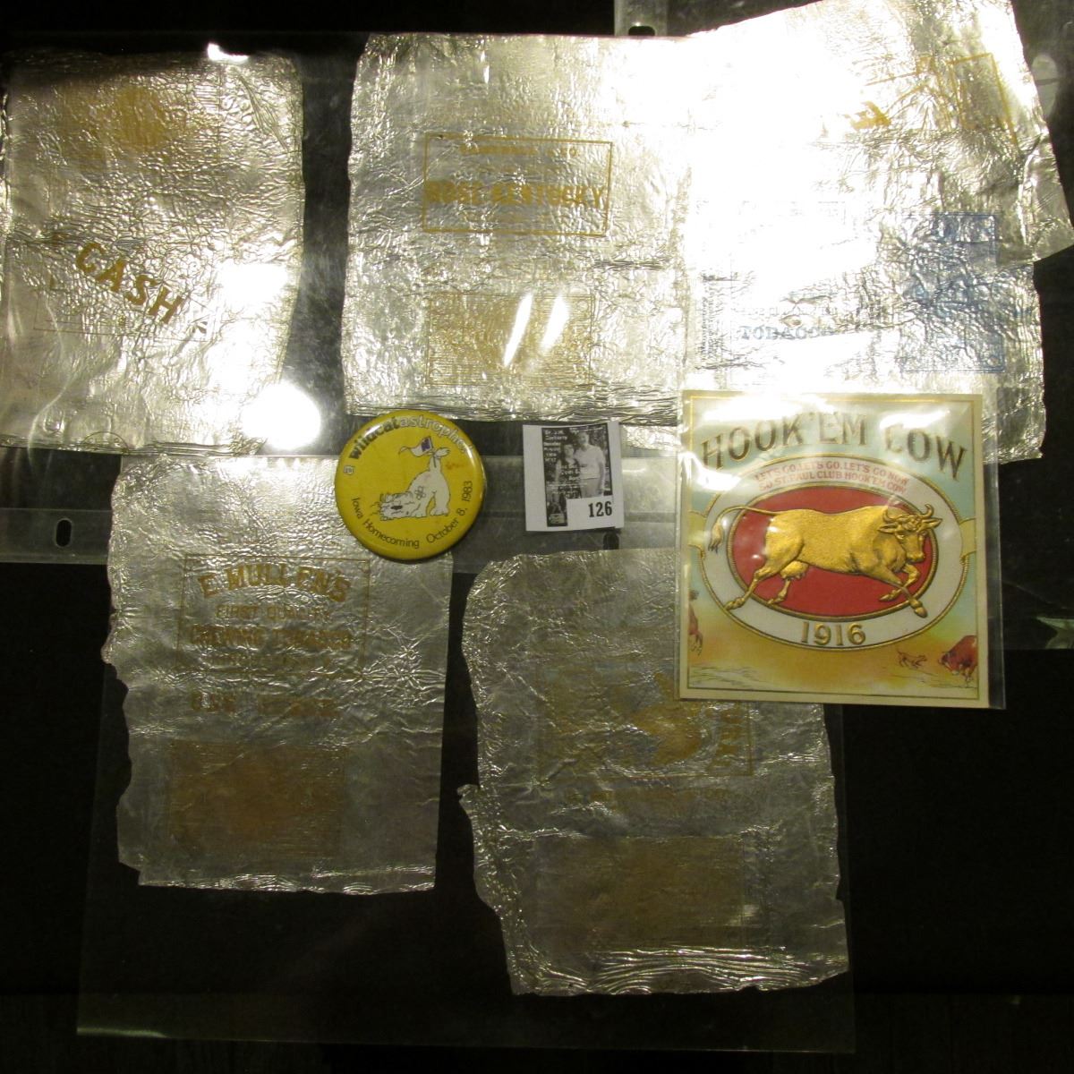 Cigar box label "Jook'em Cow…1916"; 1983 Iowa Homecoming Pin-back; & several Tobacco Plug Foils with imprinted Revenue Stamps, which 'Doc' considered rare.