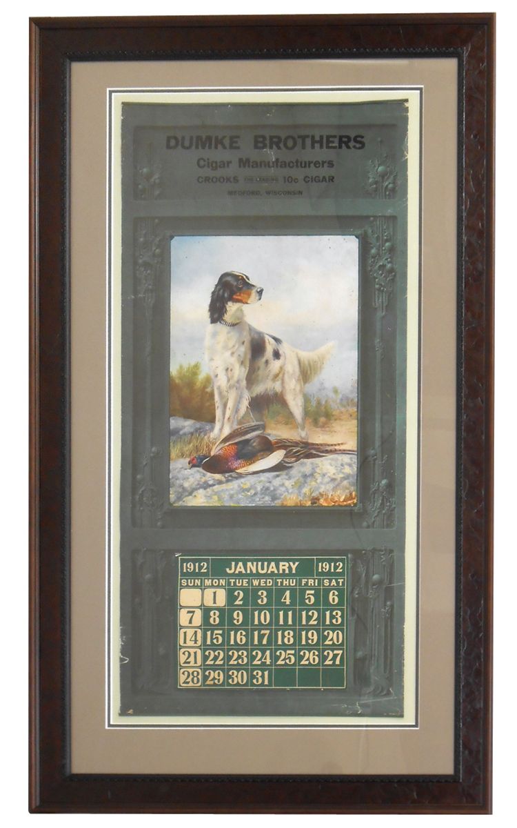 Cigar calendar, Dumke Brothers Cigar Mfg.-Medford, WI, c.1912, titled "Retrieved", shows retriever w/pheasant, Good cond w/bright color, both top & bottom bands present, shows overall specks w/some edge & top tears, prof framed & double matted, 42"H x 27"W.