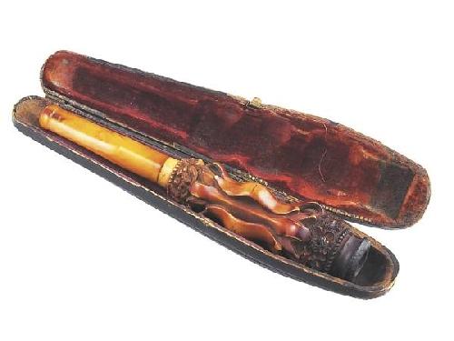 Carved sepiolite with amber mouthpiece, original leather case with velvet and silk lining. Austrian, late 19th century. Length: 19 cm