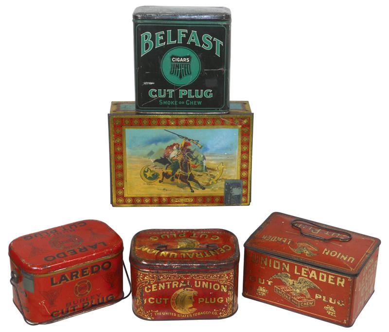 Cigar & tobacco tins (5), Union Leader, Central Union & Laredo lunchboxes, Belfast Cut Plug tin & Be