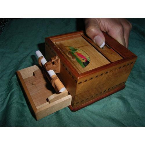 You put the cigarets in above, and then, when you want to give somebody a cigaret, you pull this cover back again, and then the drawer under opens,and then a cigaret comes out, who automaticaly goes in the dog his mouth.