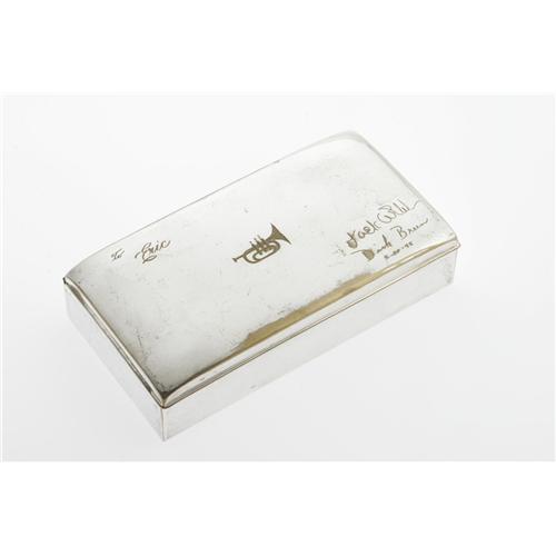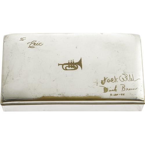 <B>Cigarette Case from Jack Webb.</B></I> In 1955 actor/director Jack Webb created what some consider one of his finest works, "Pete Kelly's Blues," a hard-hitting drama about a jazz trumpet player fighting gangsters and corruption in 1927 Kansas City. Peggy Lee's performance was nominated for an Oscar, and the film was re-created as a TV series a few years later. Written by Dragnet scribe Dick Breen, the unit production manager on the film was Eric Stacey. In appreciation for his work, Mr. Stacey was given this silver cigarette box inscribed by Mr. Webb and Mr. Breen. It measures 6.25" x 3.25" and is dated 5-20-55. A very rare piece from one of television's most recognized figures. Acquired from Eric Stacey, Jr., son of Mr. Stacey.