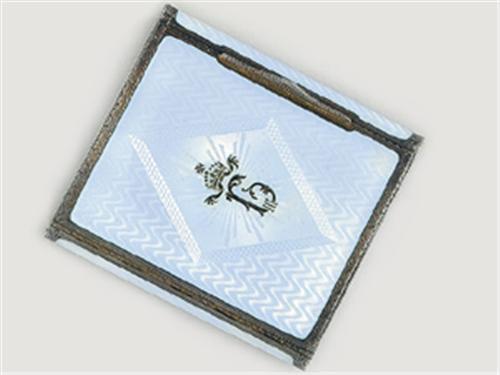 Silver, rectangular form with curved sides, hinged cover on the longer side, on the whole surface guilloche base with light blue lustre enamel decoration, on the front side G III. initials and crown, on the narrow rim engraved by hand, gilt interior, sterling 935 mark, weight: 194.0 g, very good condition.