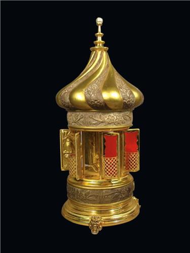 Cigarette Holder Music Box with Aladdin Motif, brass and gold paint. Works. 17 1/2 inches tall.