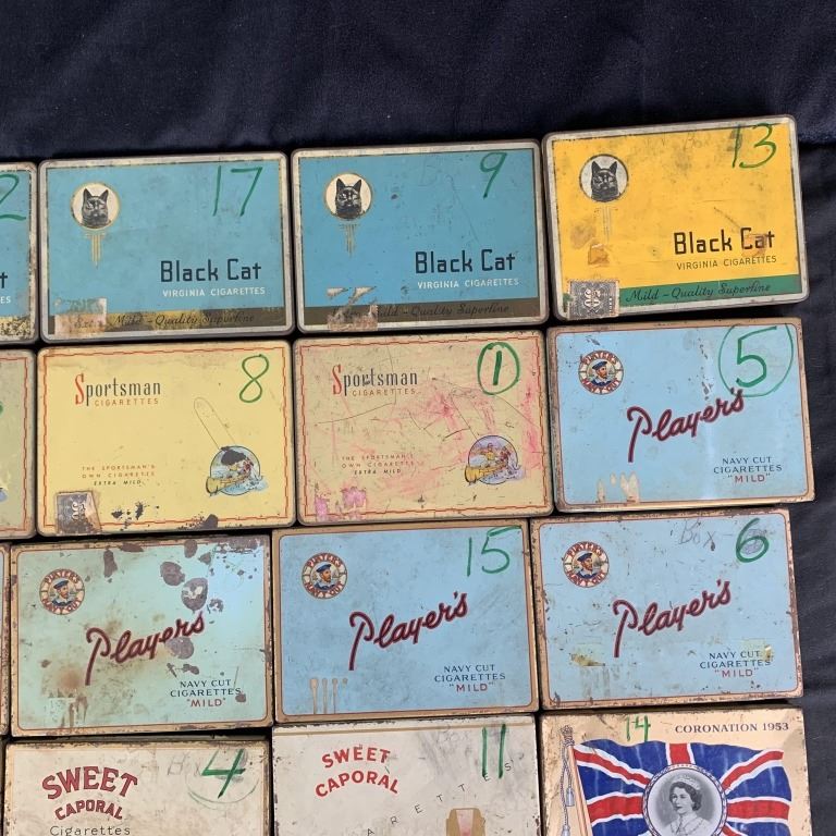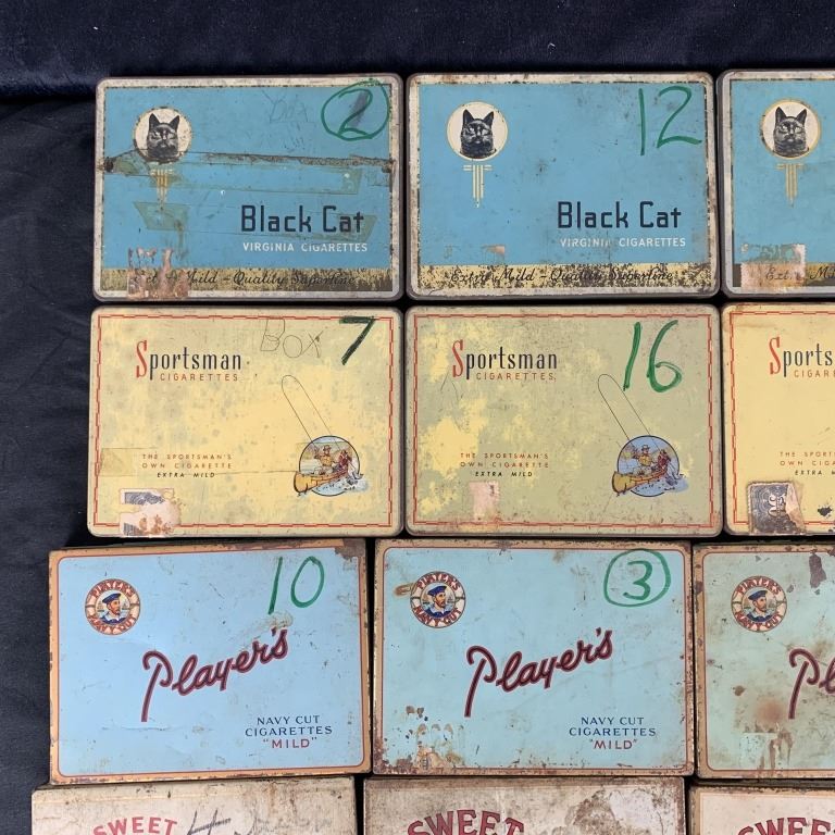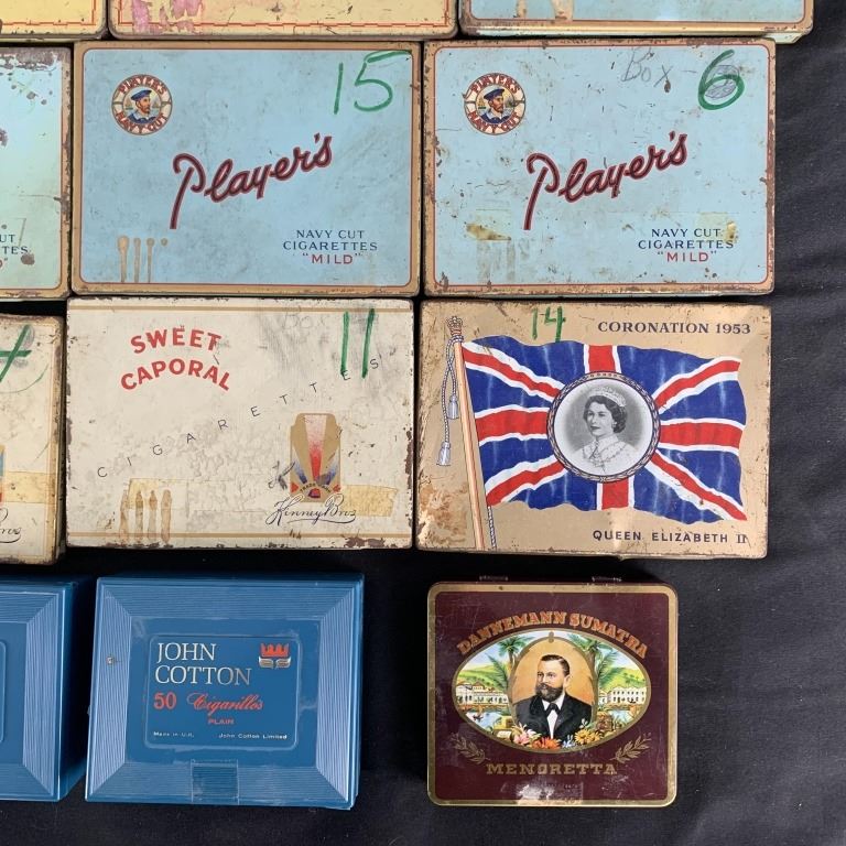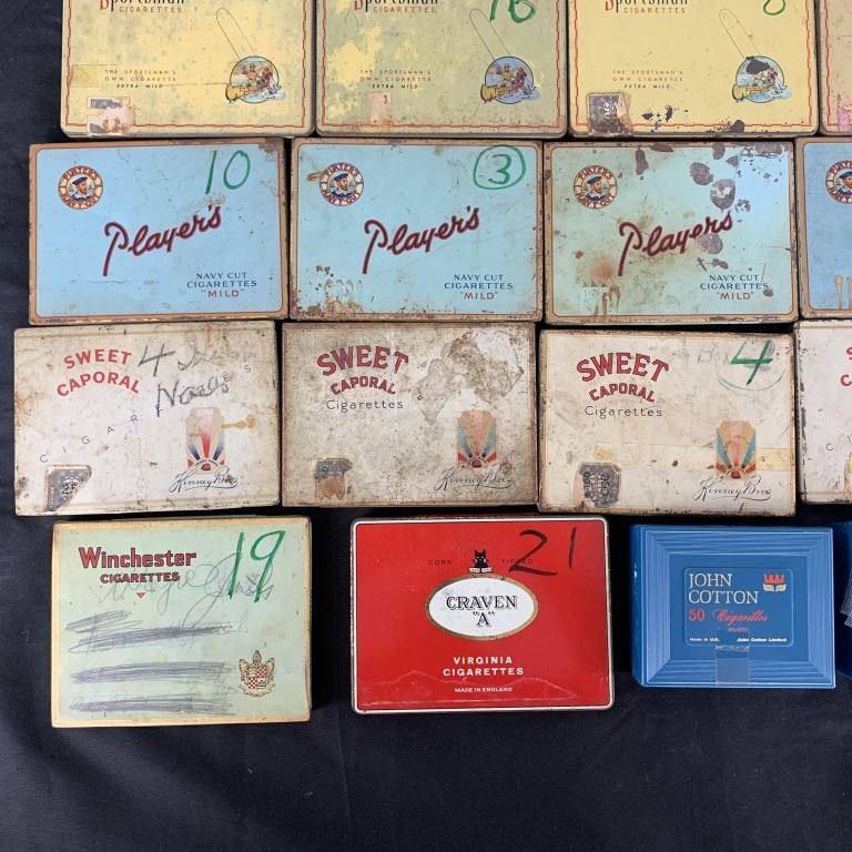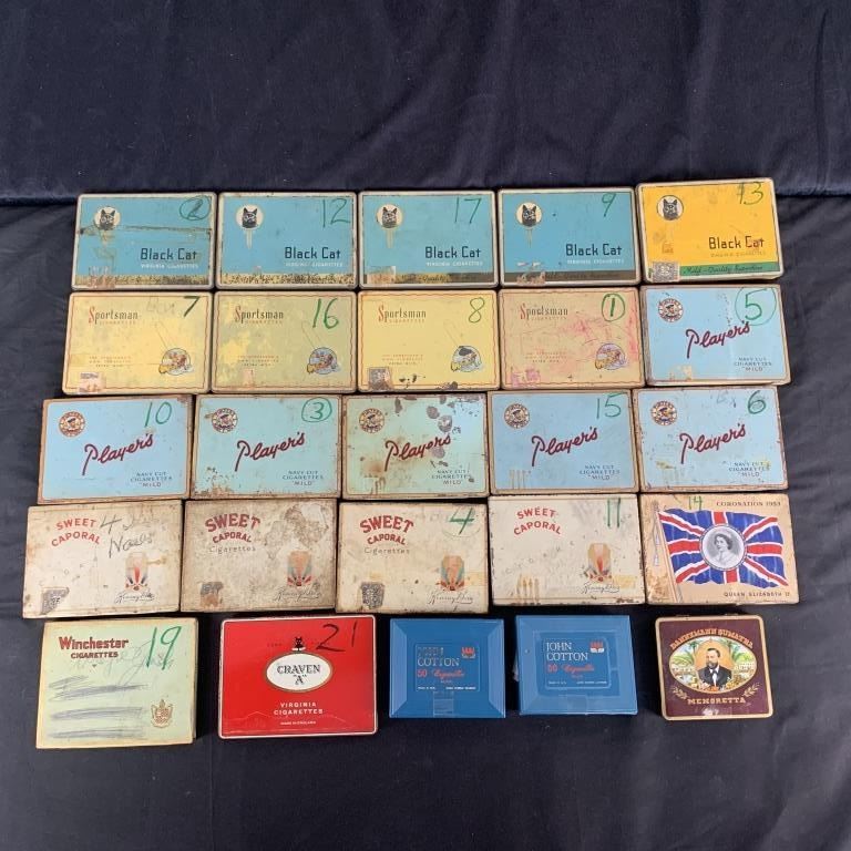 A small collection of vintage cigarette and tobacco tins. Includes 2- John Cotton, 6- Players, 4- Kinney Bros, 5- Black Cat, 4- Sportsman, 1- Dannemann Sumatra, 1- Winchester, 1- Craven A, 1- QEII Corontation. Generally, okay to fair condition.