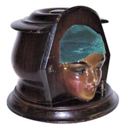 Cigarette dispenser, push plunger to dispense cigarette through lady's mouth, wood, 1920's, 7"H.