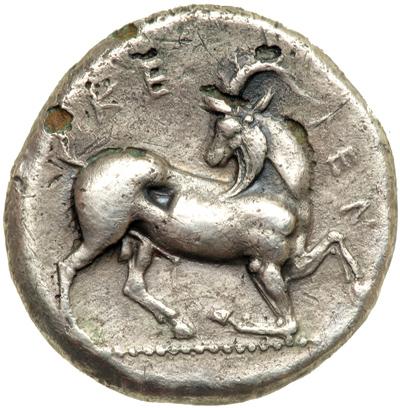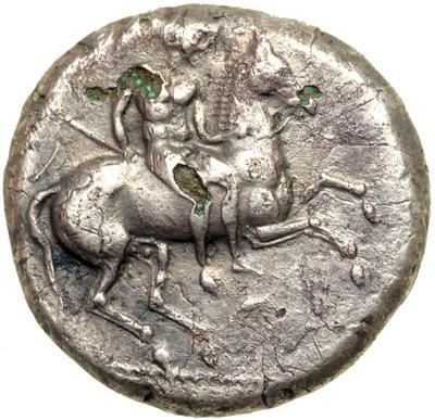 Cilicia, Kelenderis, c. 400-333 BC. Fourrée Stater (9.28 g). Rider seated sideways on horse prancing right, from which he is ready to dismount. Reverse: Goat kneeling right, looking backwards. Dewing 2483; BMC 20. A number of chips on both sides, revealing the copper core. Fine to Very Fine.