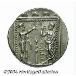 Cilicia, Tarsos. Datames, Satrap. 378-372 B.C. AR stater (23 mm, 10.56 g). Baaltars seated right,, holding grain ear and grape-bunch in right hand, eagle-tipped sceptre in left; thymiaterion to right; all within crenelated wall / Ana, nude, standing right, facing Datames standing left; both have right arm raised; thymiaterion between; all within quadrilinear border. SNG Levante 83 var. (no inscription for Ana); SNG France 2, 298 var. (eagle under throne); SNG von Aulock 5948. Toned XF. Important notice: Heritage usually auctions material at the rate of 200-250 lots per hour. On some occasions eBay Live bid software or the Internet may not be able to keep up with the pace of the auction. We recommend placing a realistic absentee bid now as insurance to avoid disappointment. Occasionally the auctioneer may eliminate or reject an eBay Live bid, and the auctioneer may also reopen a lot after the close of the eBay live bidding (usually because we missed an audience bid), and may reject your bid even if it shows you as the winning bidder. By bidding via eBay Live, you agree that Heritage may award the lot to another bidder at its sole discretion under the circumstances described above or any other reasonable circumstances. Also please note that all Heritage lots purchased through eBay Live carry a 20% Buyer's Premium. Please make sure you read the Terms and Conditions before you bid.