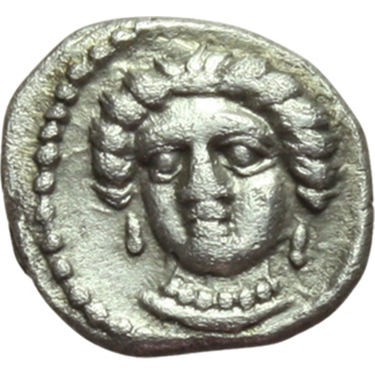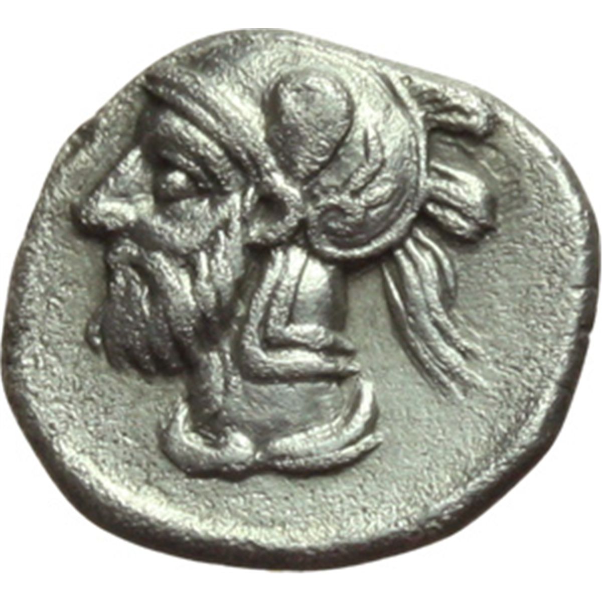 Mondo Greco. Asia Greca. Cilicia, Tarsos. Obolo, 379-372 a.C. D/ Testa femminile di fronte, con il volto tre quarti a sinistra, che indossa collana e orecchini. R/ Testa virile barbuta a sinistra, che indossa elmo crestato. SNG France 305. SNG Levante 89. AG. g. 0.81 mm. 9.00 R. Raro e molto attraente. Bel BB+/qSPL.