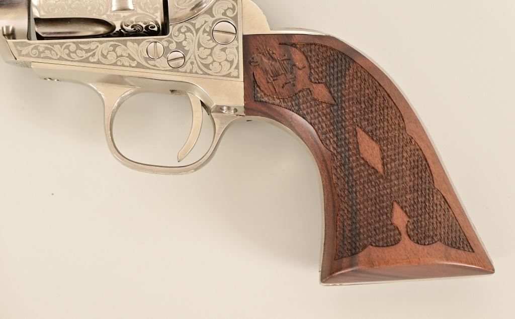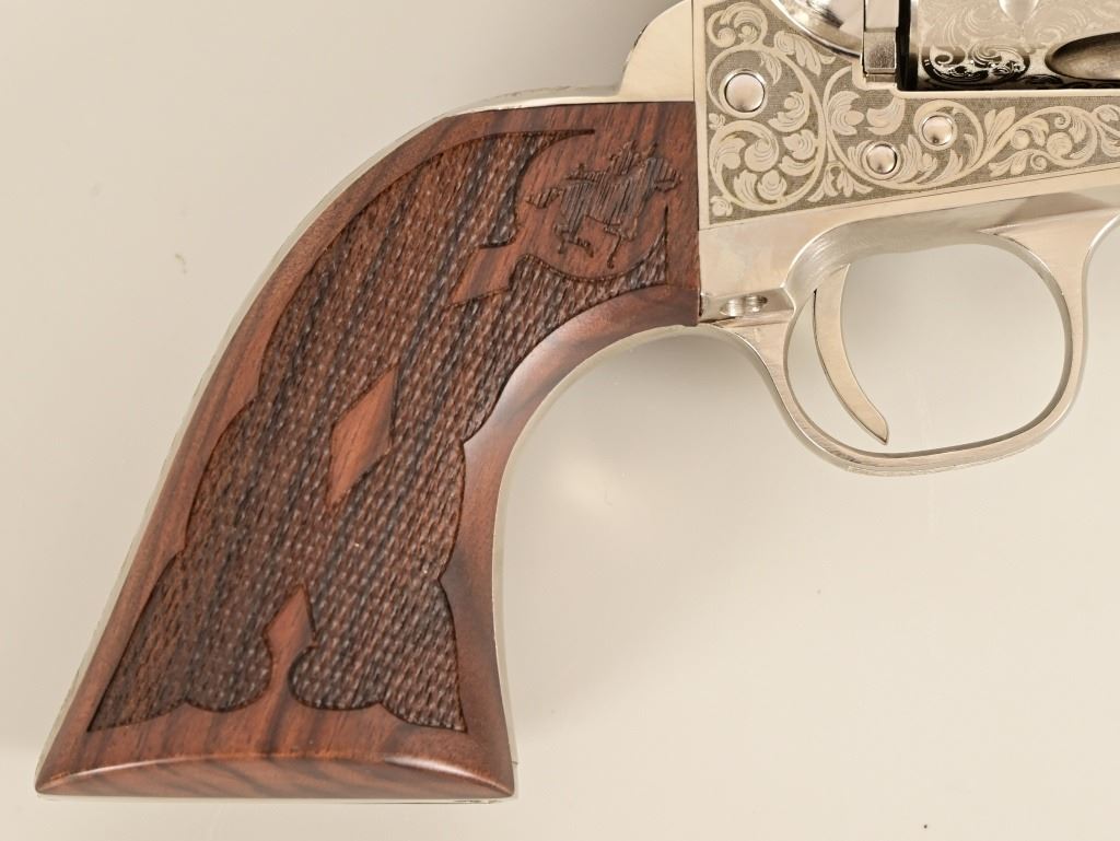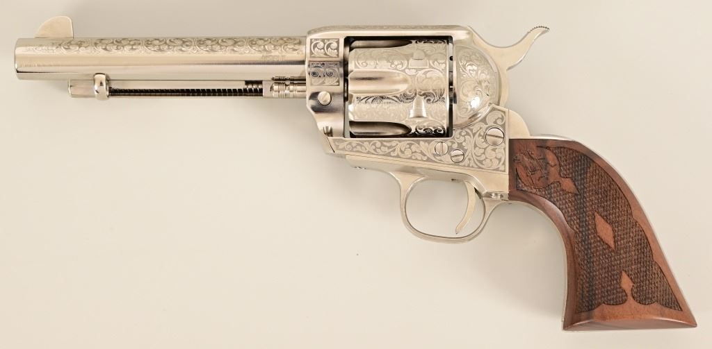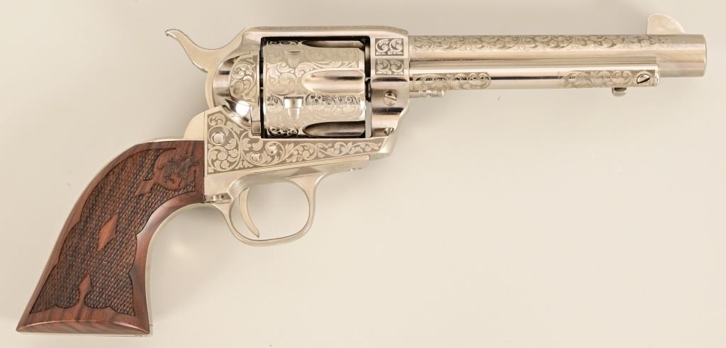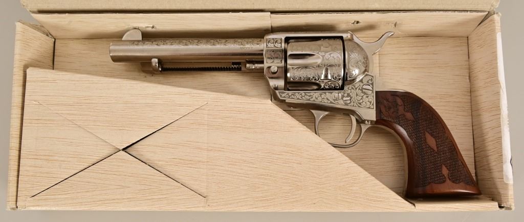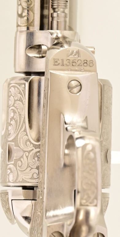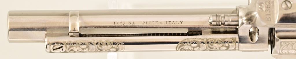 S/N E136288. Like new in box. 5.5" barrel. Nickel with factory laser engraving. Fancy checkered grips. Made by Pietta. Modern.